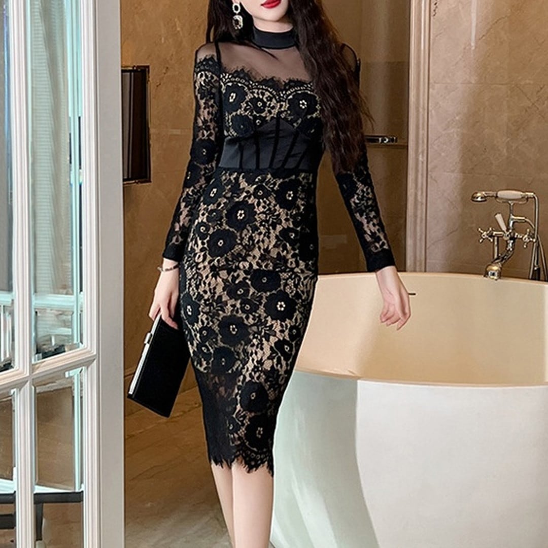 ハイネックとシアーなトップスが、女性らしい華やかさを演出します。ウエストを美しくシェイプするデザインで、スタイルアップ効果も期待できます。