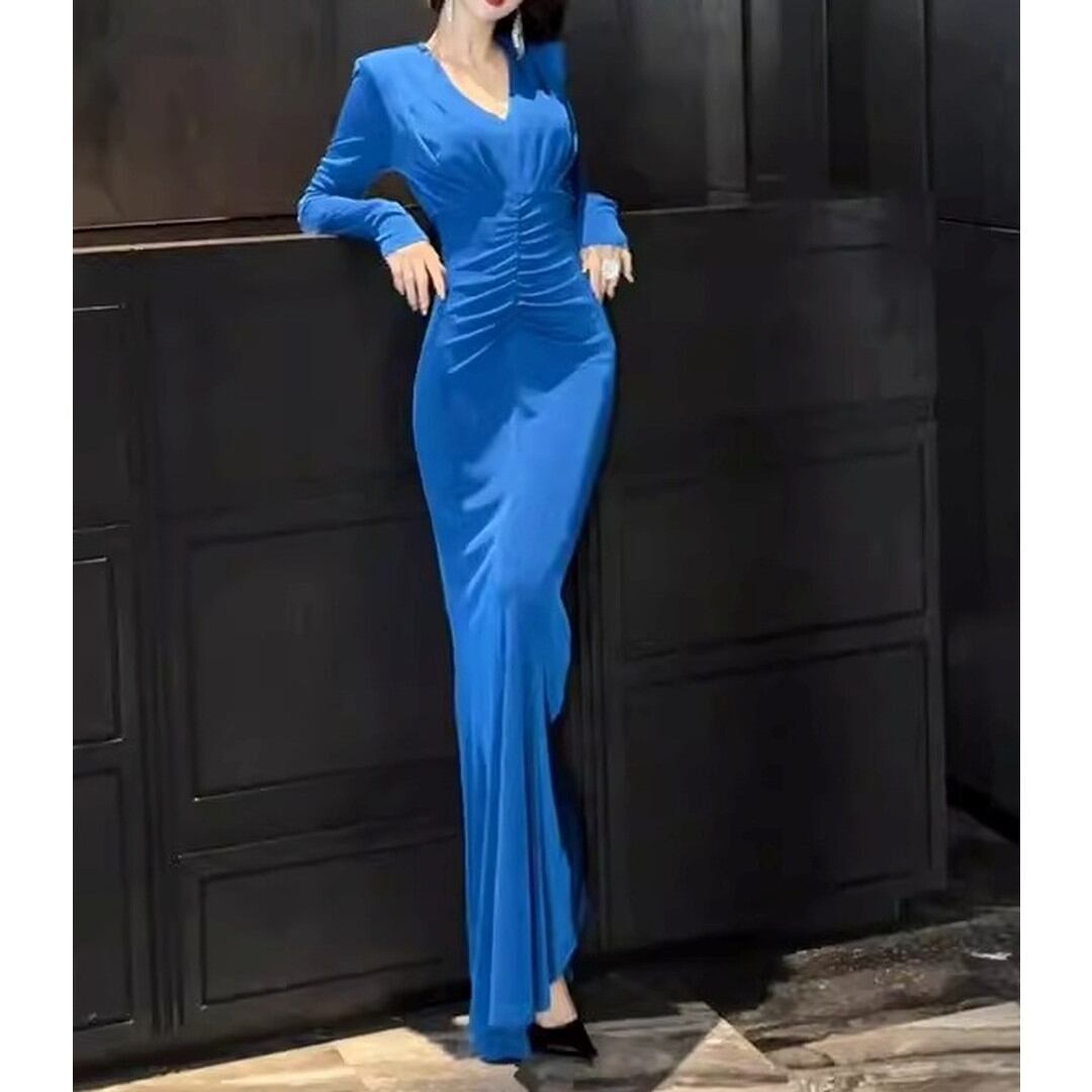 Vネックとロングスリーブがエレガントなロングマーメイドドレス。ボディラインを美しく魅せるシルエットと、上品なVネックデザインが、洗練された大人の女性を演出します。