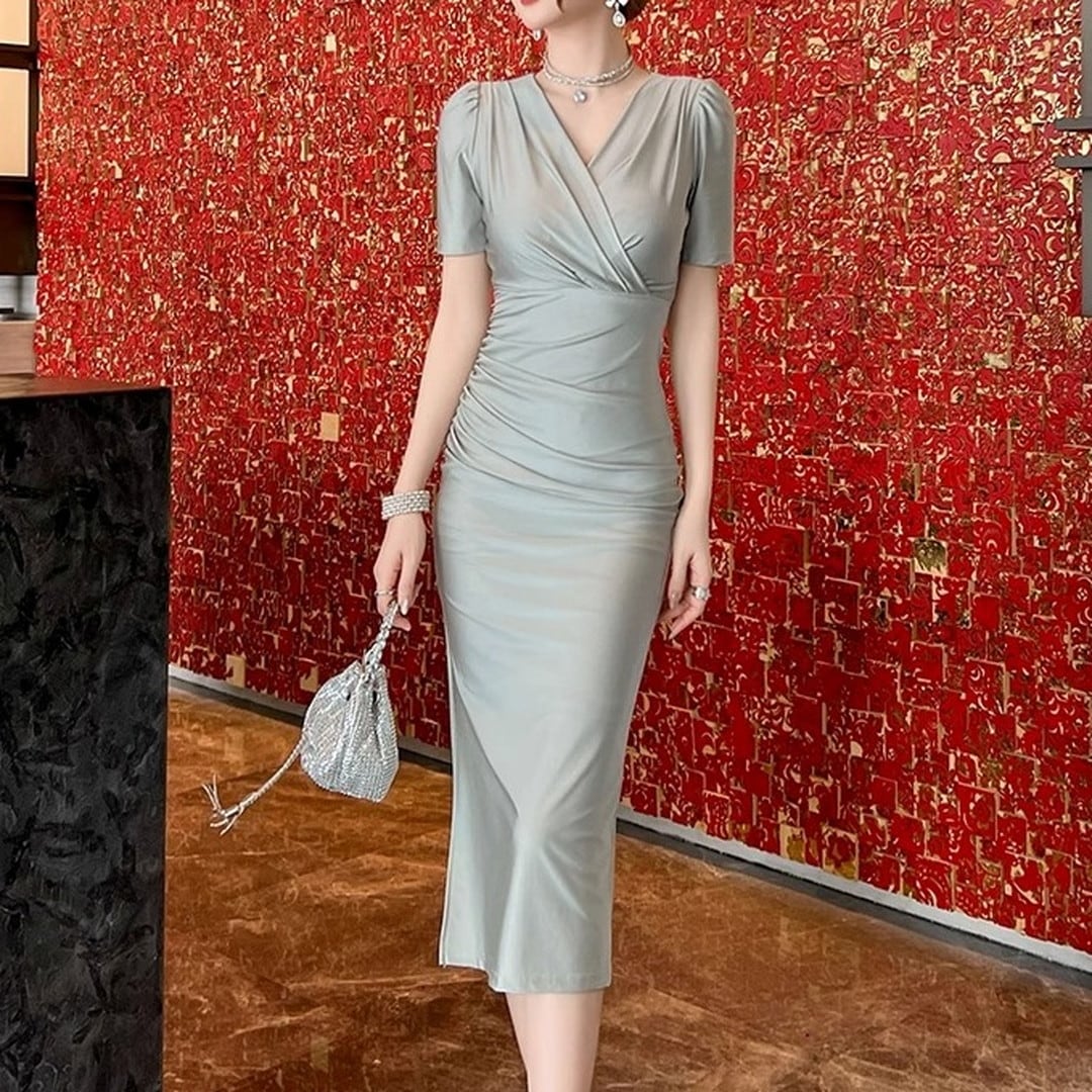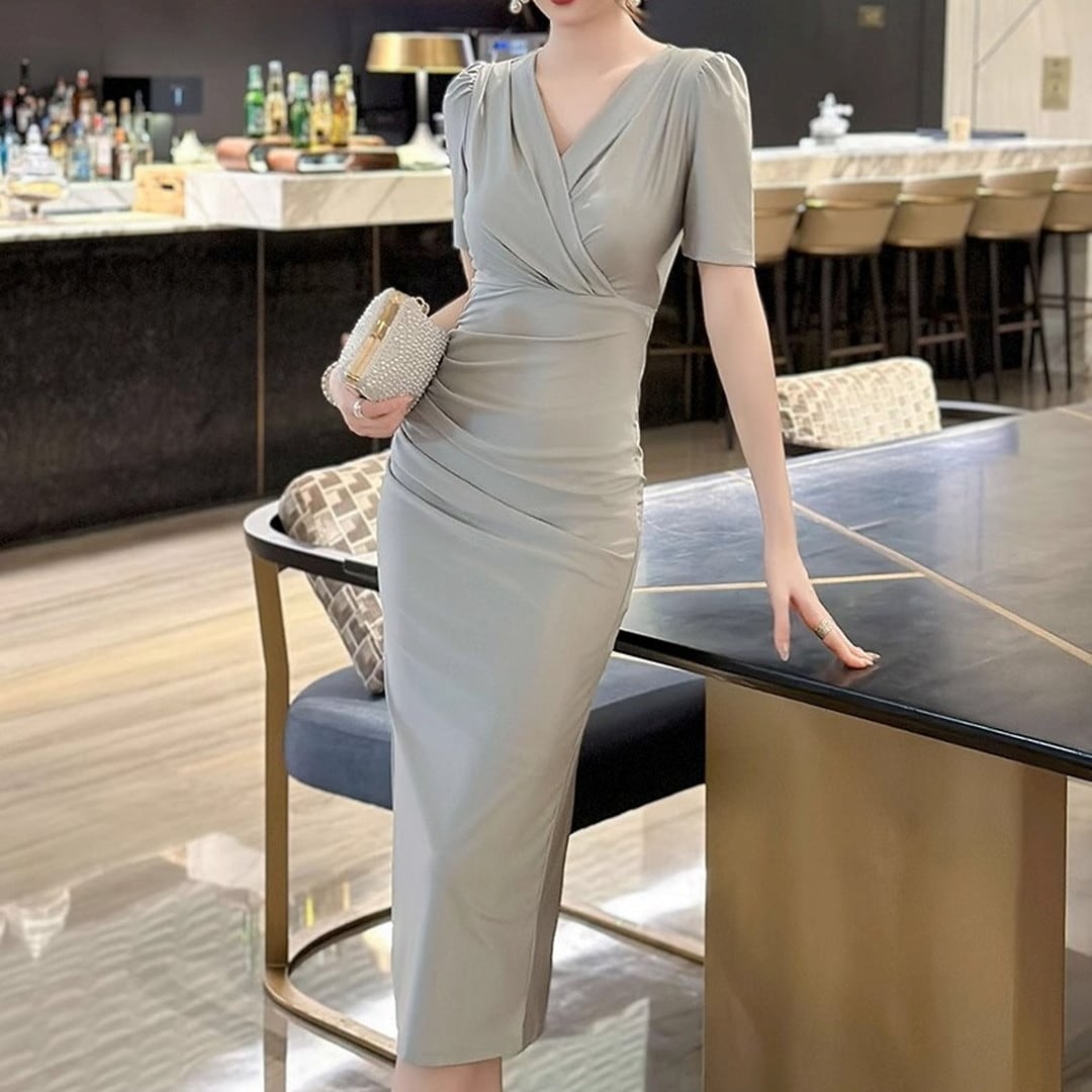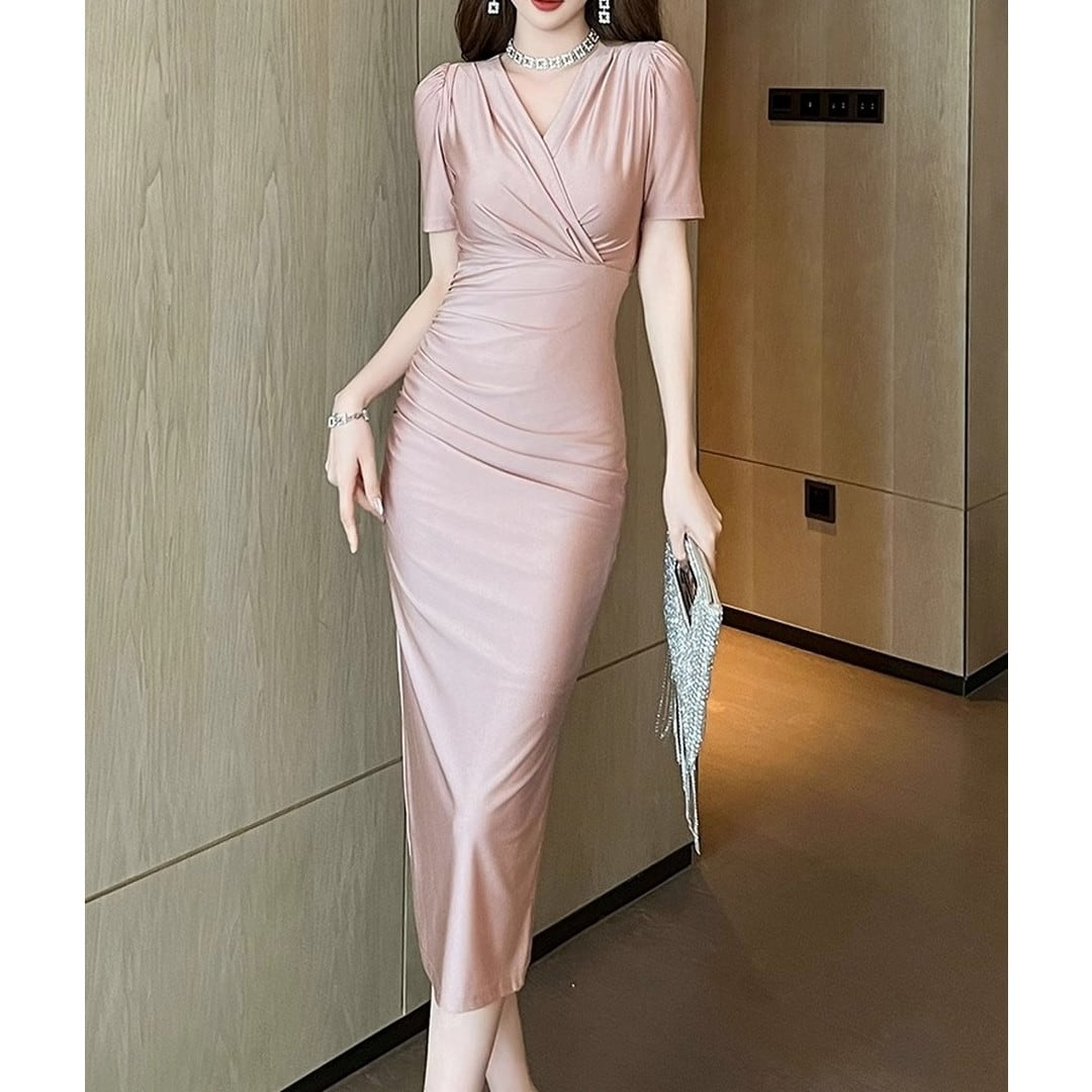 Vネックデザインとプレーティングが魅力のラップドレスです。