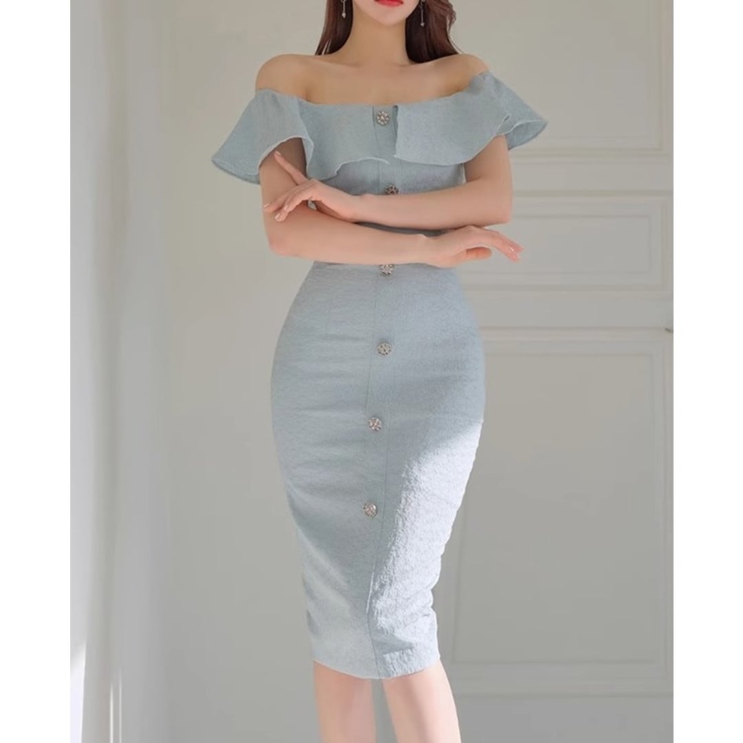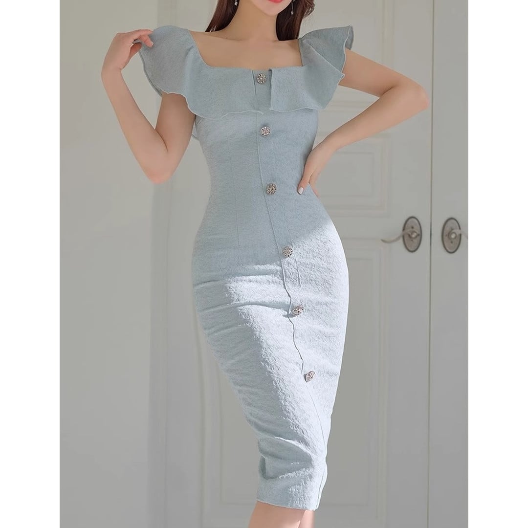 スクエアネックとフレンチスリーブが女性らしいシルエットを演出するミディ丈スカート。ウエストラインを美しく見せるデザインで、上品かつ洗練されたスタイルを叶えます。