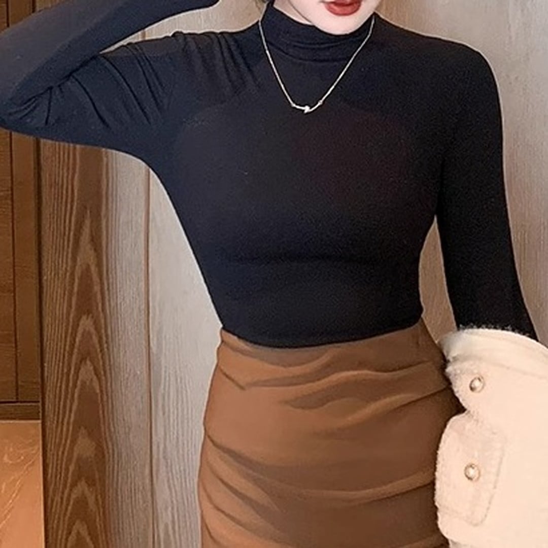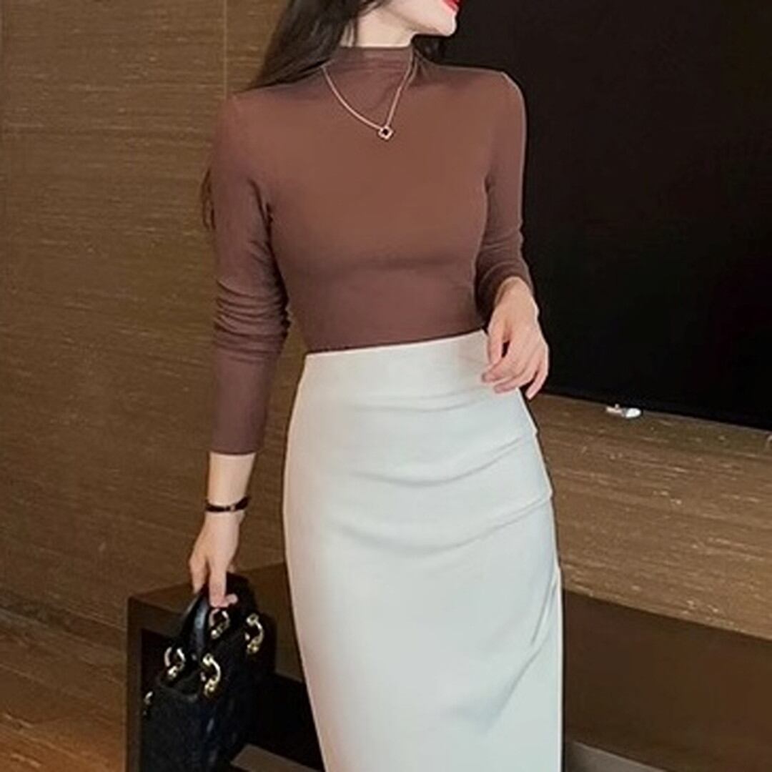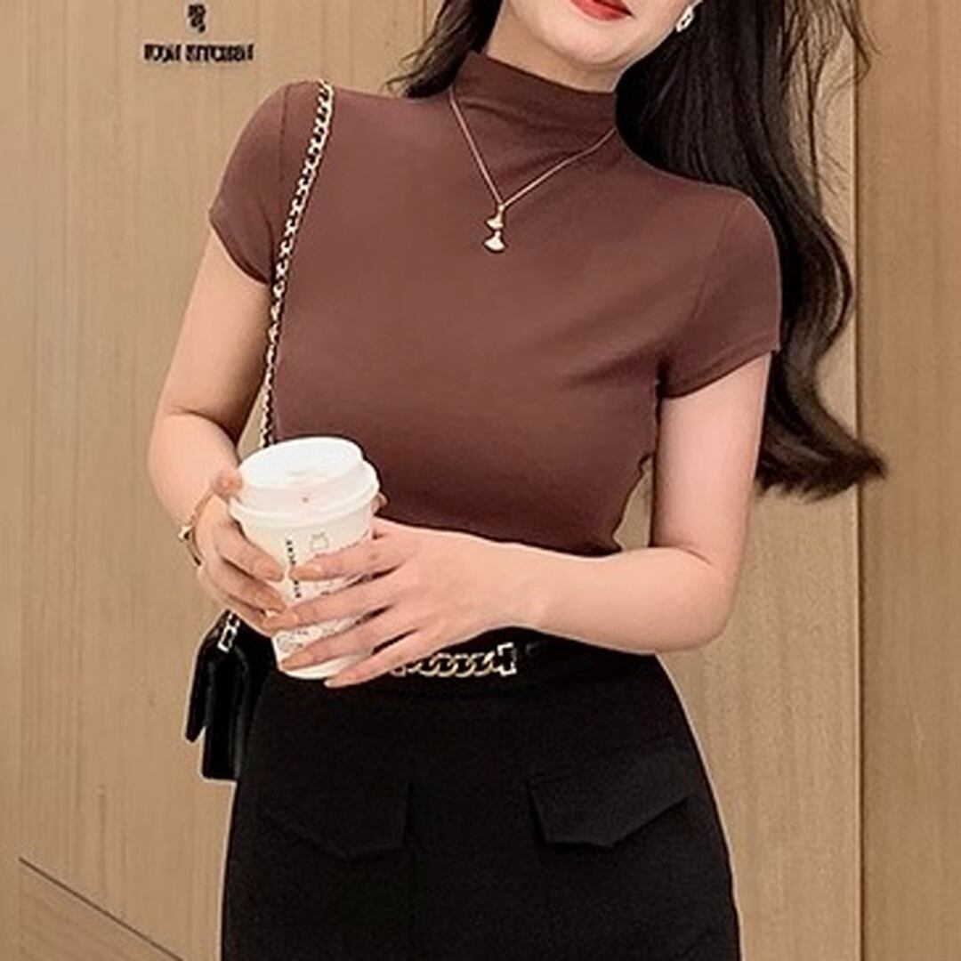 半袖ハーフタートルネックトップス。上品で洗練された印象を与え、オフィスシーンからデイリーユースまで幅広い場面で活躍します。シンプルなデザインなので、アクセサリーや小物でアレンジも楽しめます。
