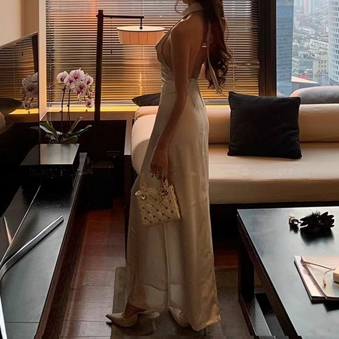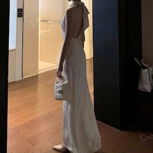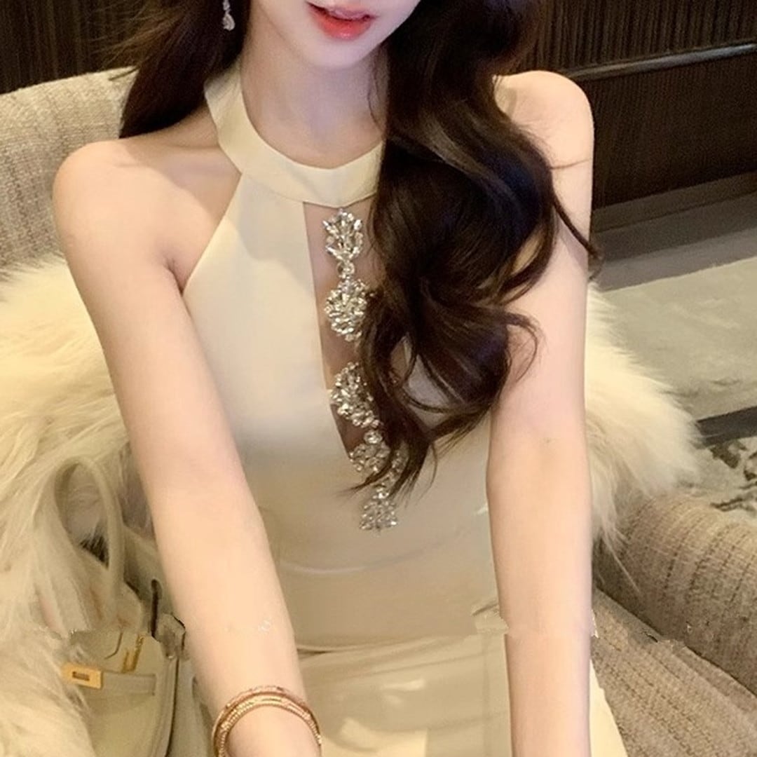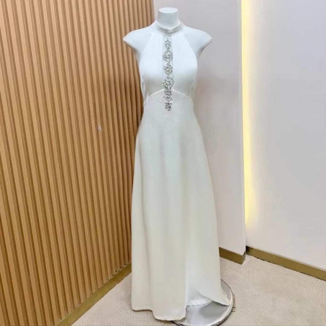 このロングスカートは、華やかなビーズ装飾とスリットネックが魅力的な一枚です。 パーティーや特別な日の装いに最適で、洗練された大人の女性を演出します。