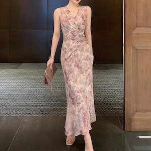 Vネックとフレアヘムが洗練された印象を与えるマキシ丈ワンピース。