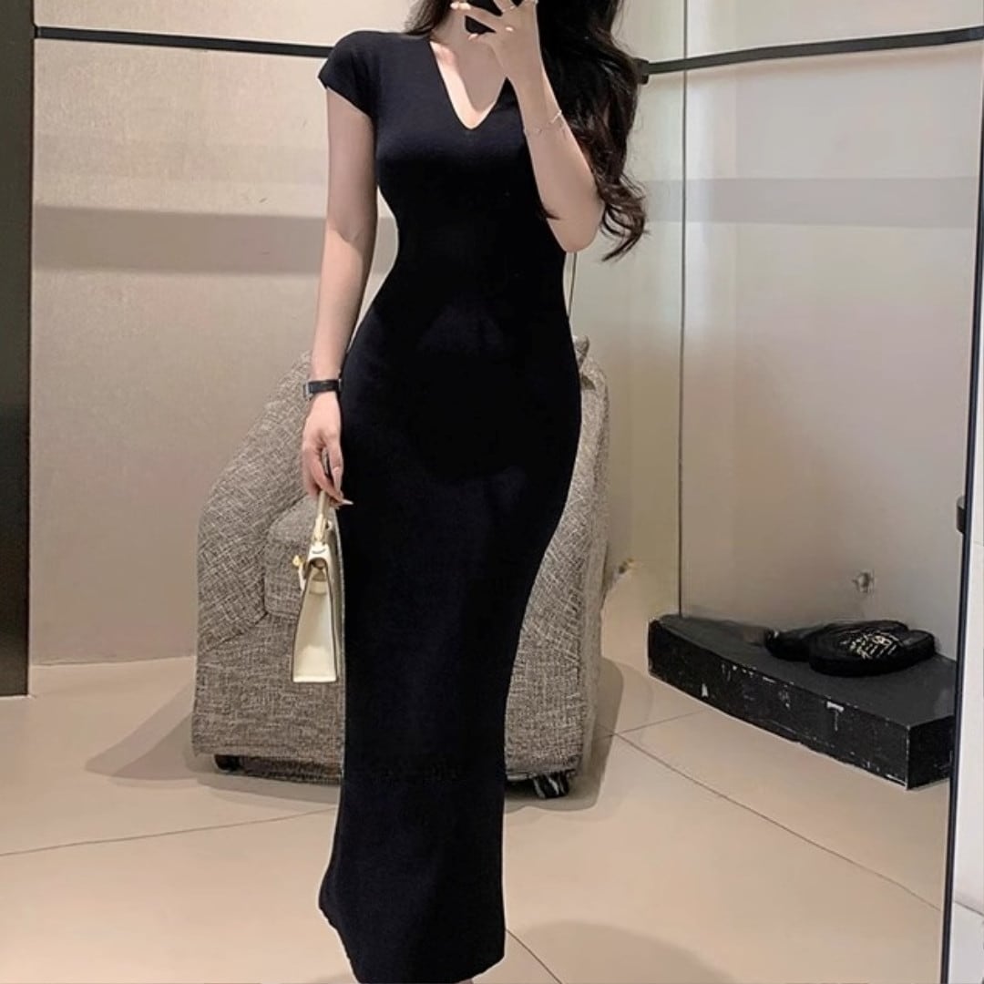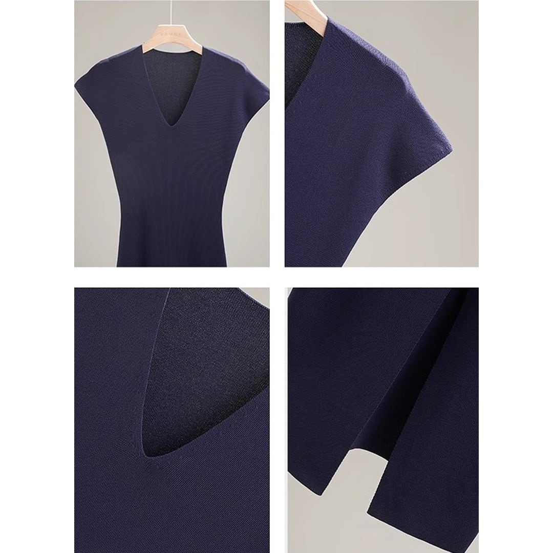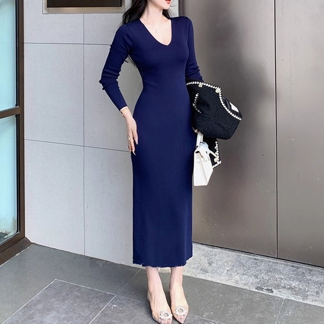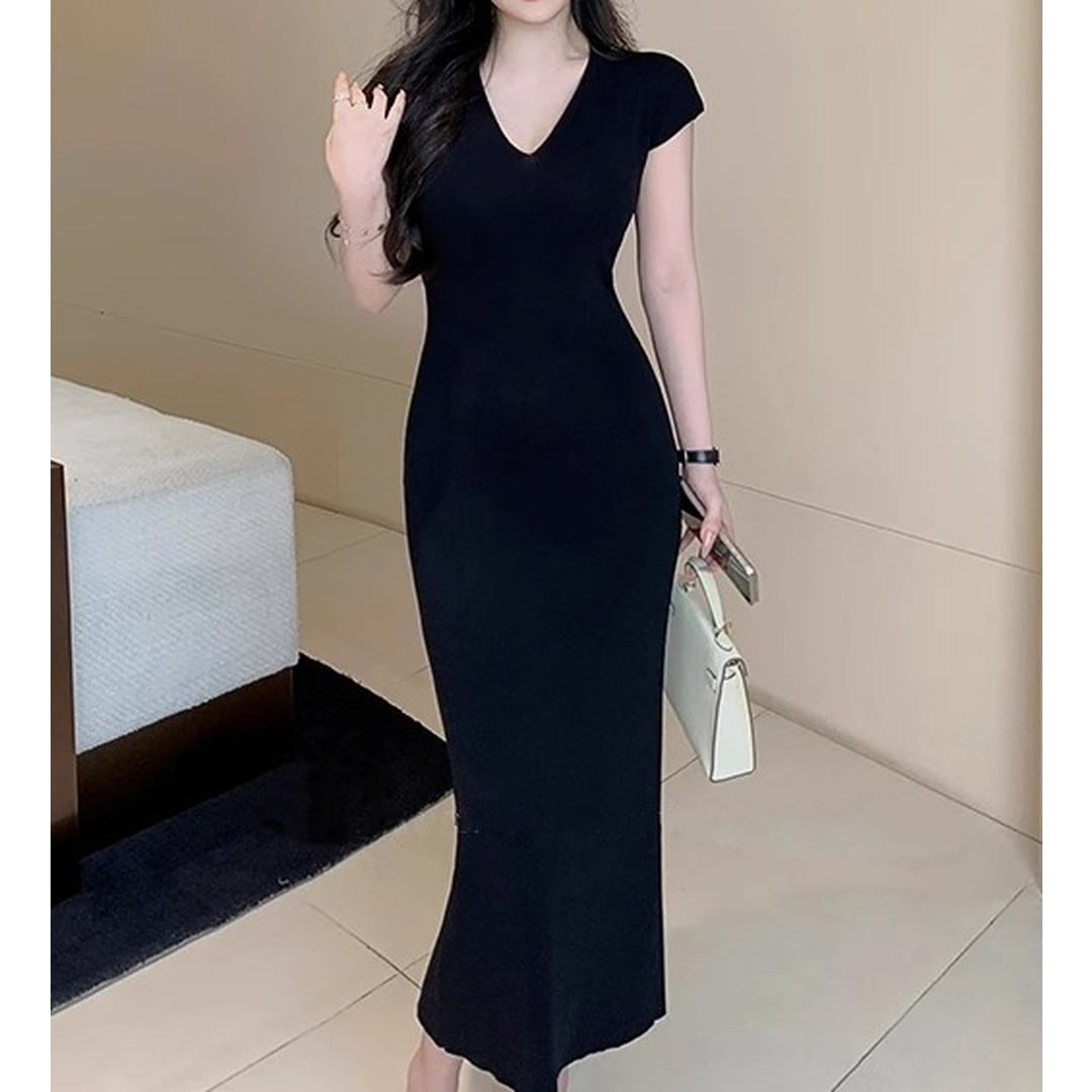 Vネックのタイトシルエットが美しいミディ丈ニットドレス。