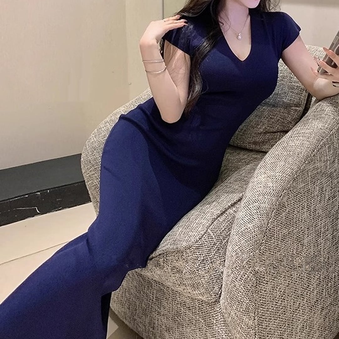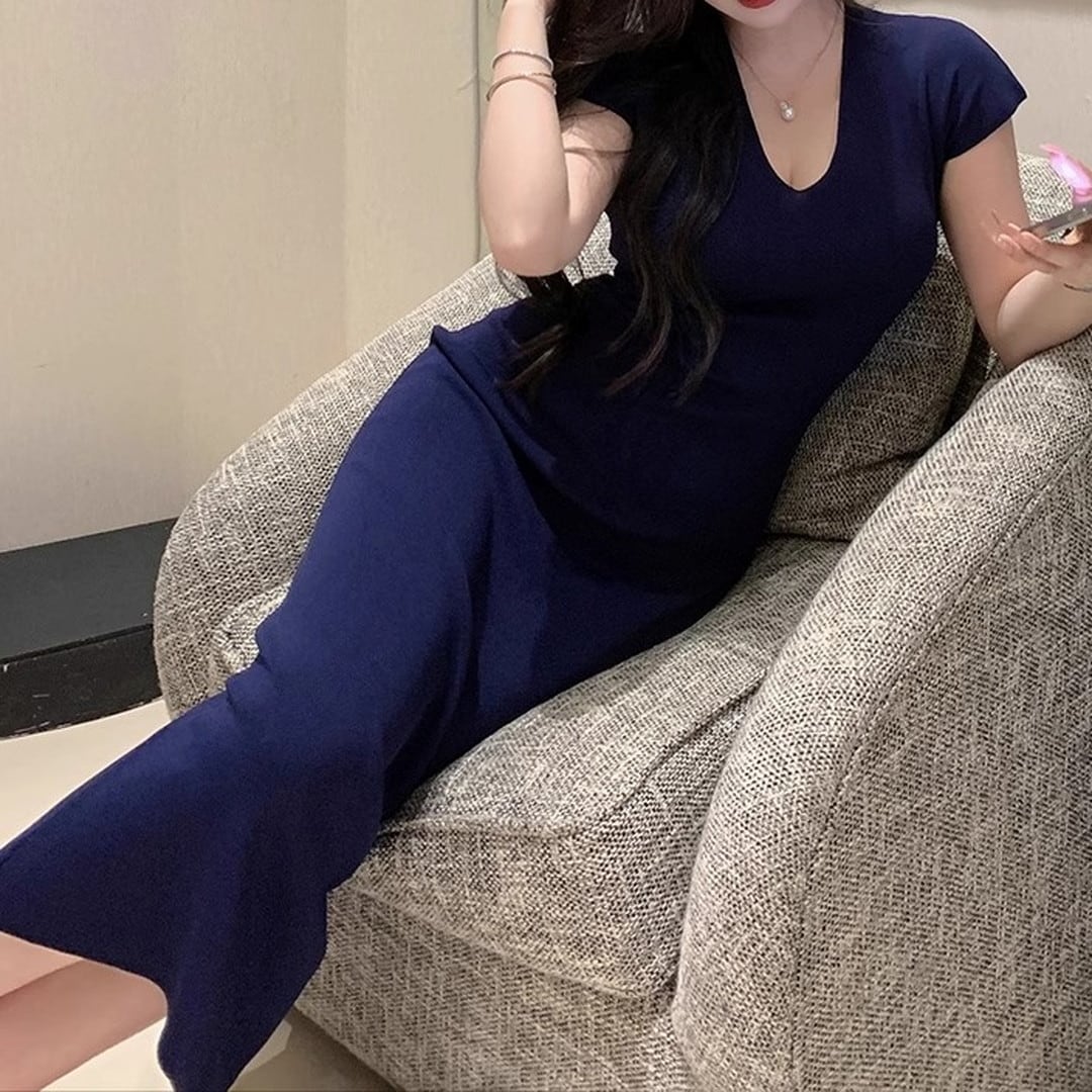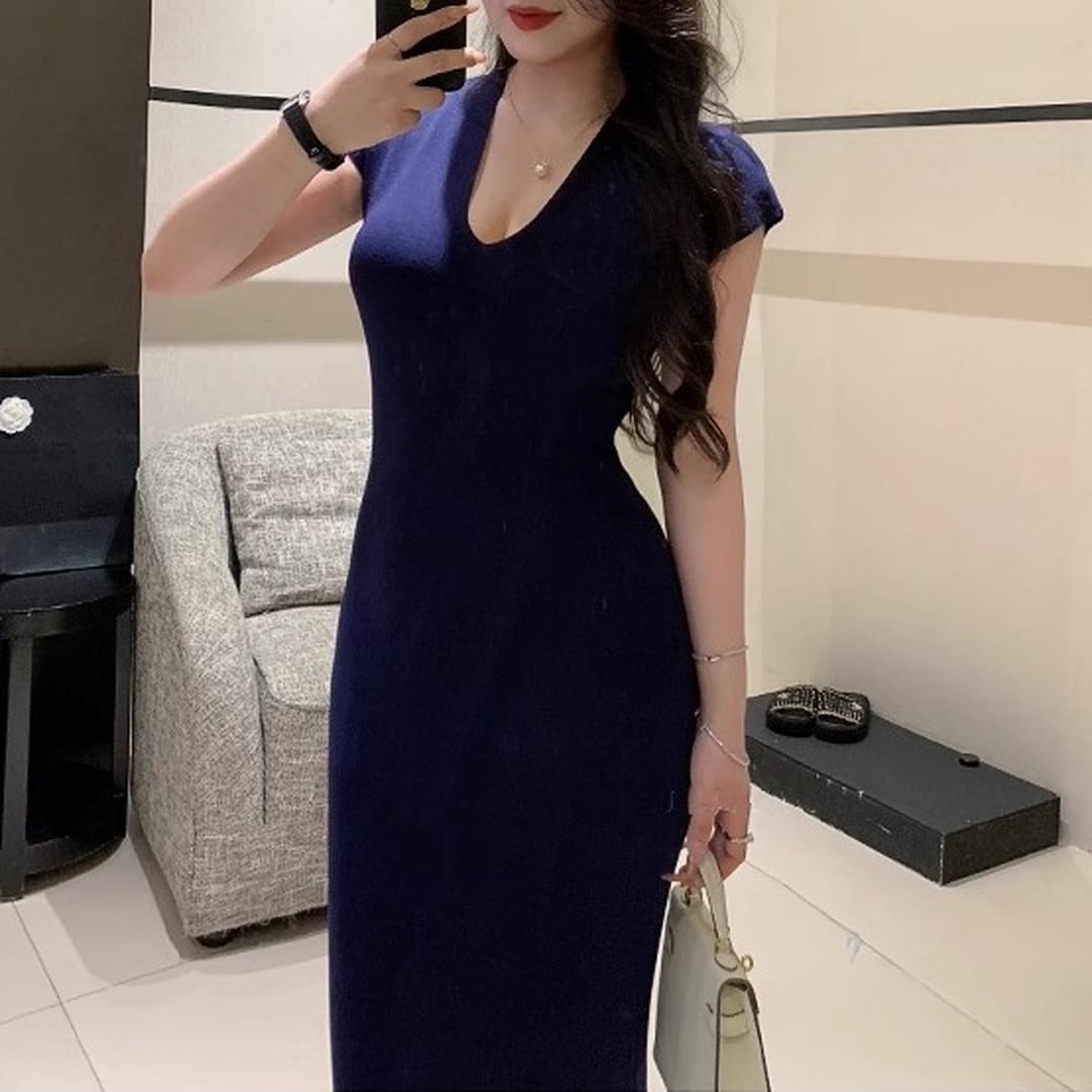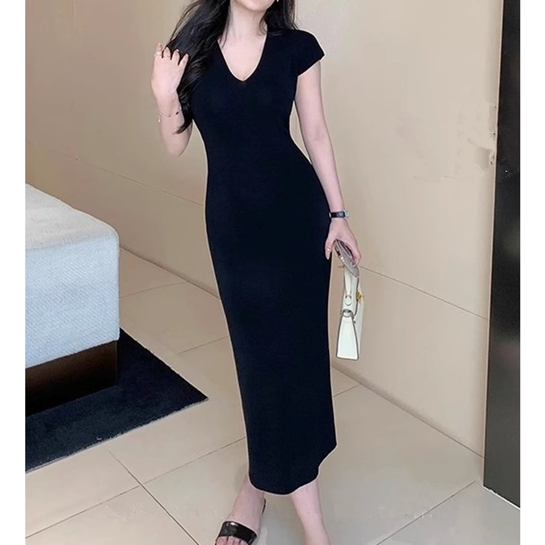 Vネックのタイトシルエットが美しいミディ丈ニットドレス。