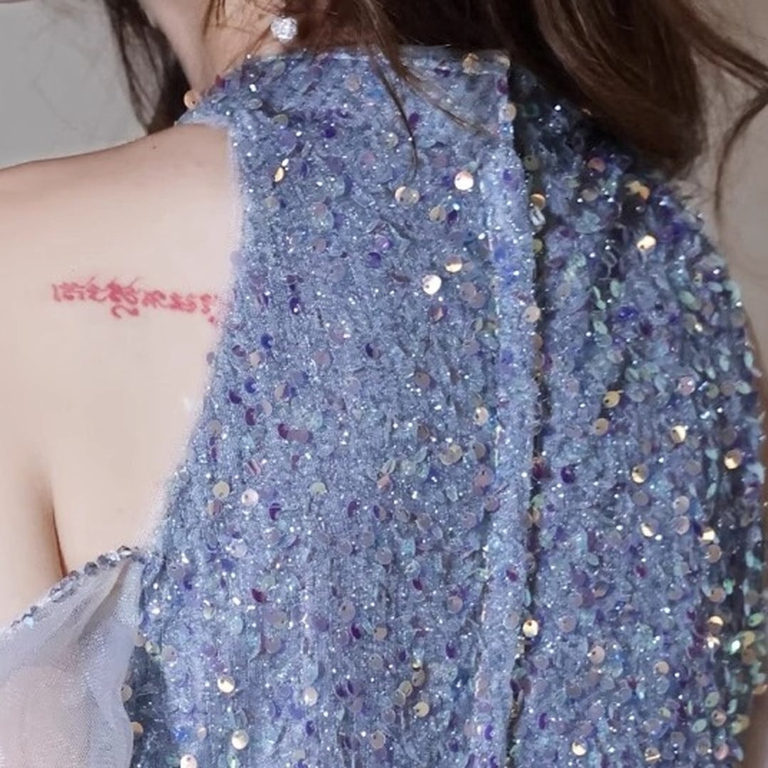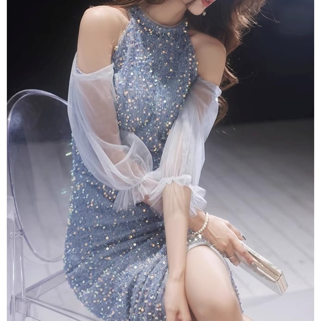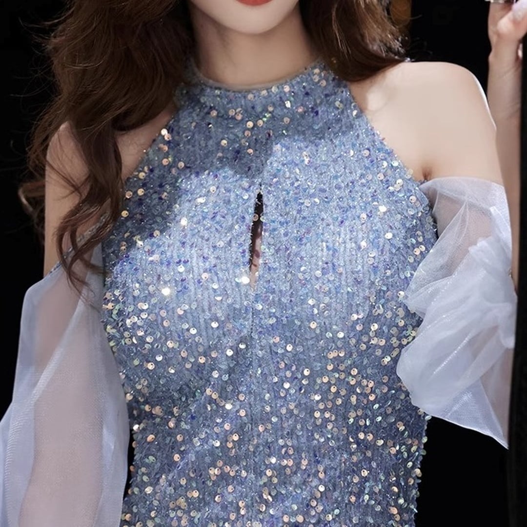 大胆なオフショルダーデザインと、輝くビーズの装飾が、華やかさと上品さを兼ね備えています。