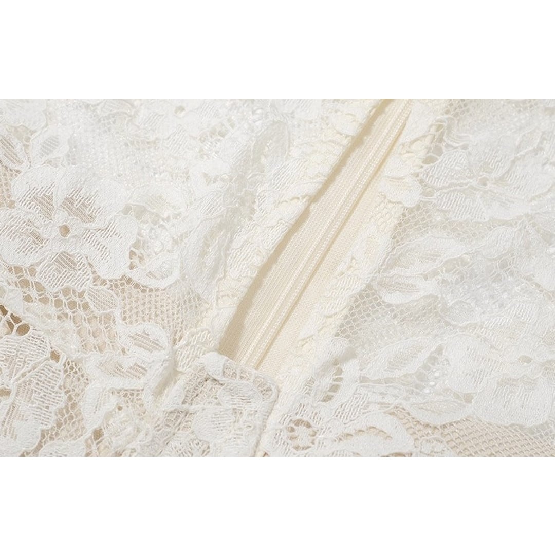 繊細なレースのトップスと、すっきりと美しいシルエットのAラインスカートのミディ丈ドレスの組み合わせが、上品で女性らしい印象を与えます。