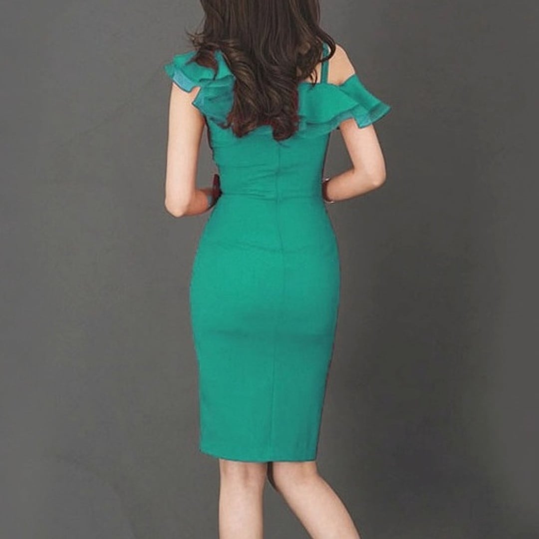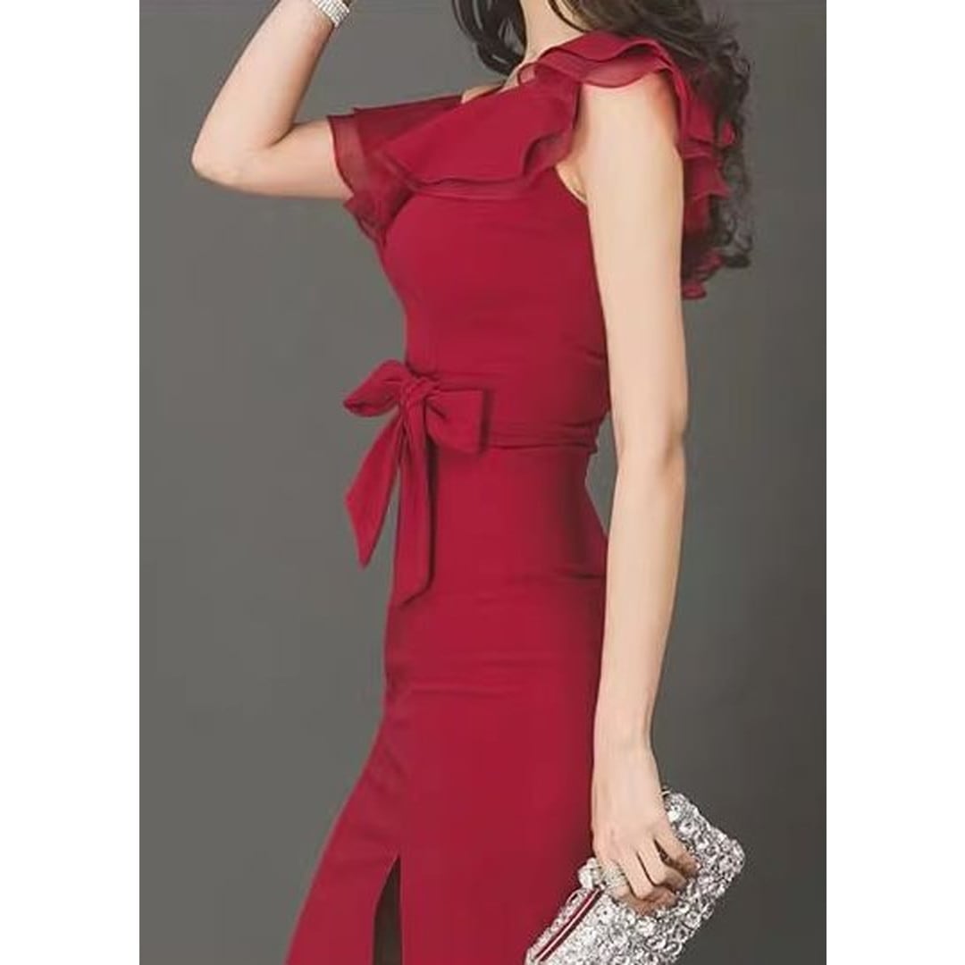 ワンショルダーのデザインとフレアスリーブが女性らしさを際立たせるタイトドレス。ウエストのリボンがアクセントとなり、上品な印象で、大人の女性の魅力を引き立てます。