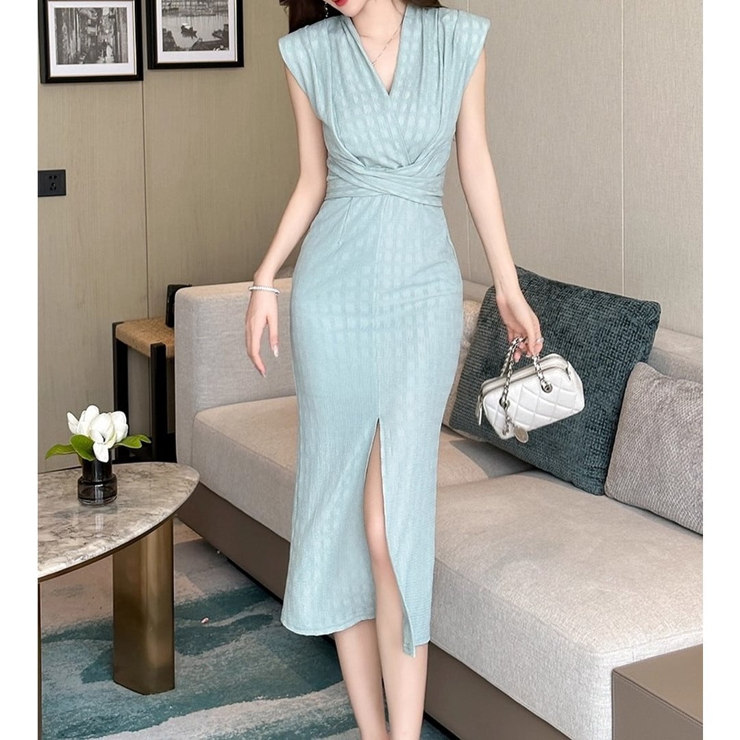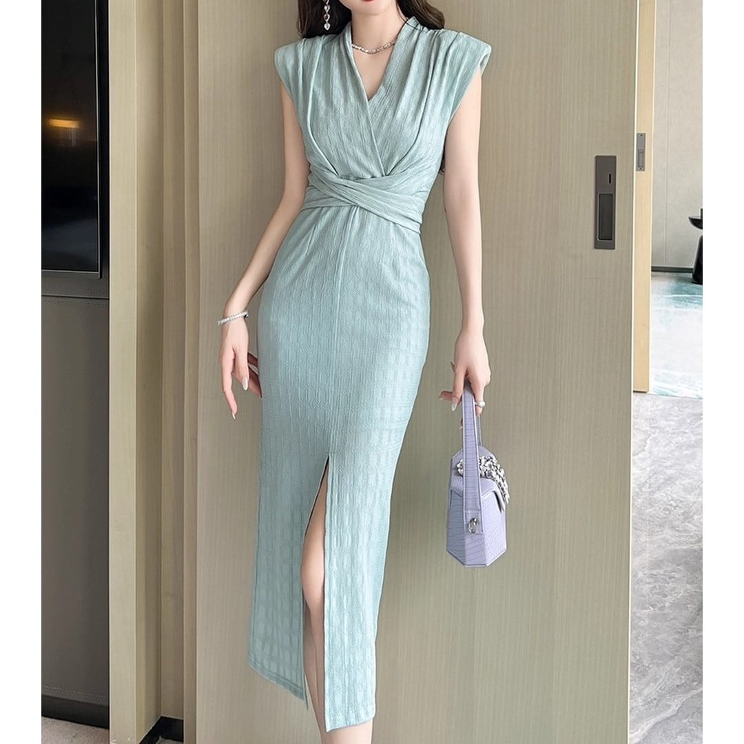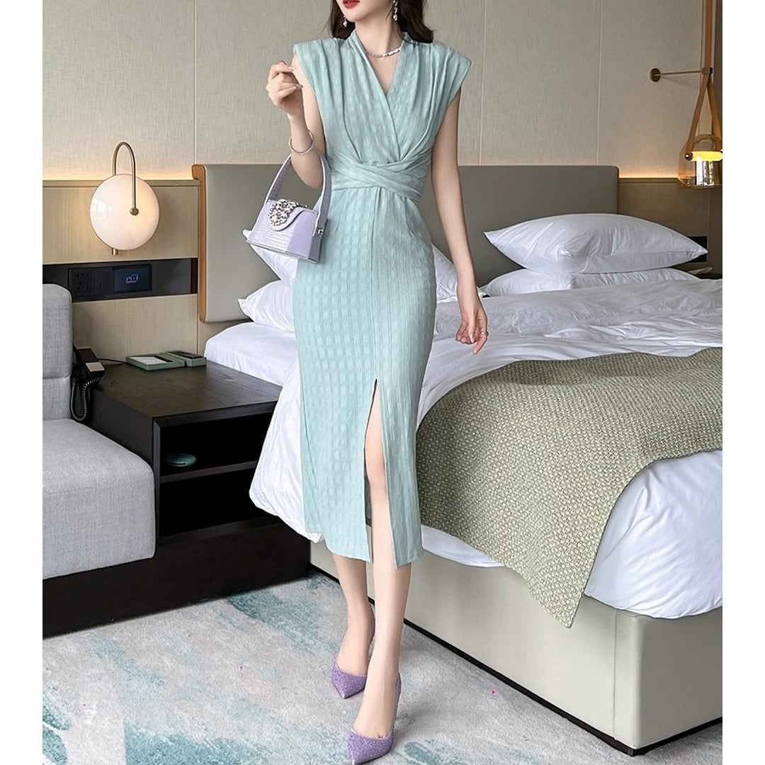 Vネックのウエストシェイプされたミディ丈ドレスは、エレガントなデザインが魅力です。程よく開いたVネックラインがデコルテを美しく演出、ウエストのシェイプされたデザインが女性らしいボディラインを強調します。フロントのスリット入りで動きやすさもプラス。