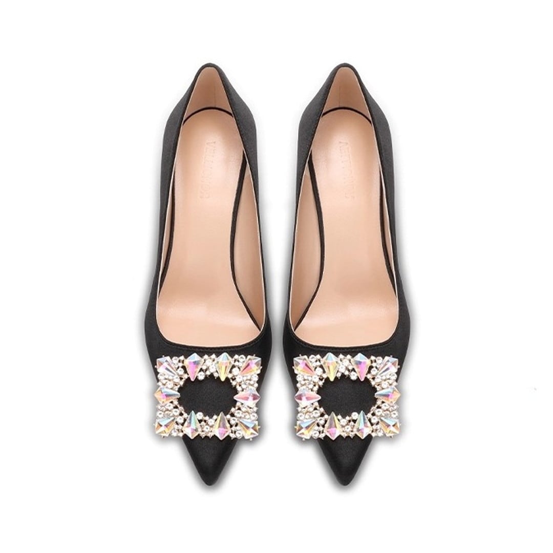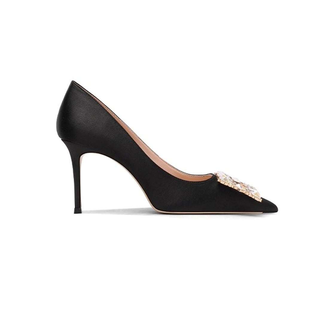 上品な光沢を放つポインテッドトゥのパンプスです。スクエア型のバックル装飾が、足元を華やかに彩ります。ピンヒールは程よい高さで、歩きやすさと美しさを両立。フォーマルな場面からパーティーシーンまで、幅広いスタイルに合わせられます。洗練されたデザインで、自信に満ちた足取りを演出します。
