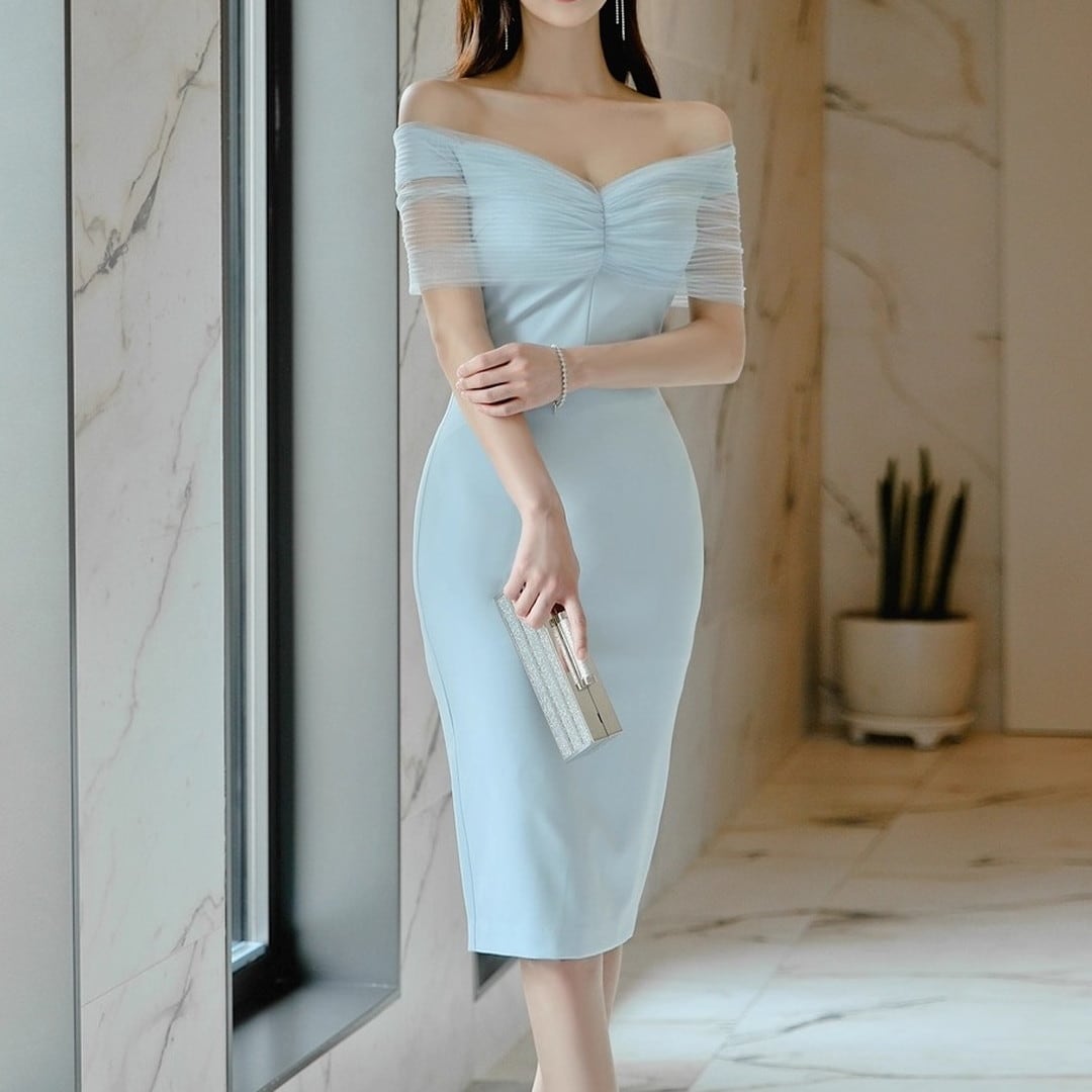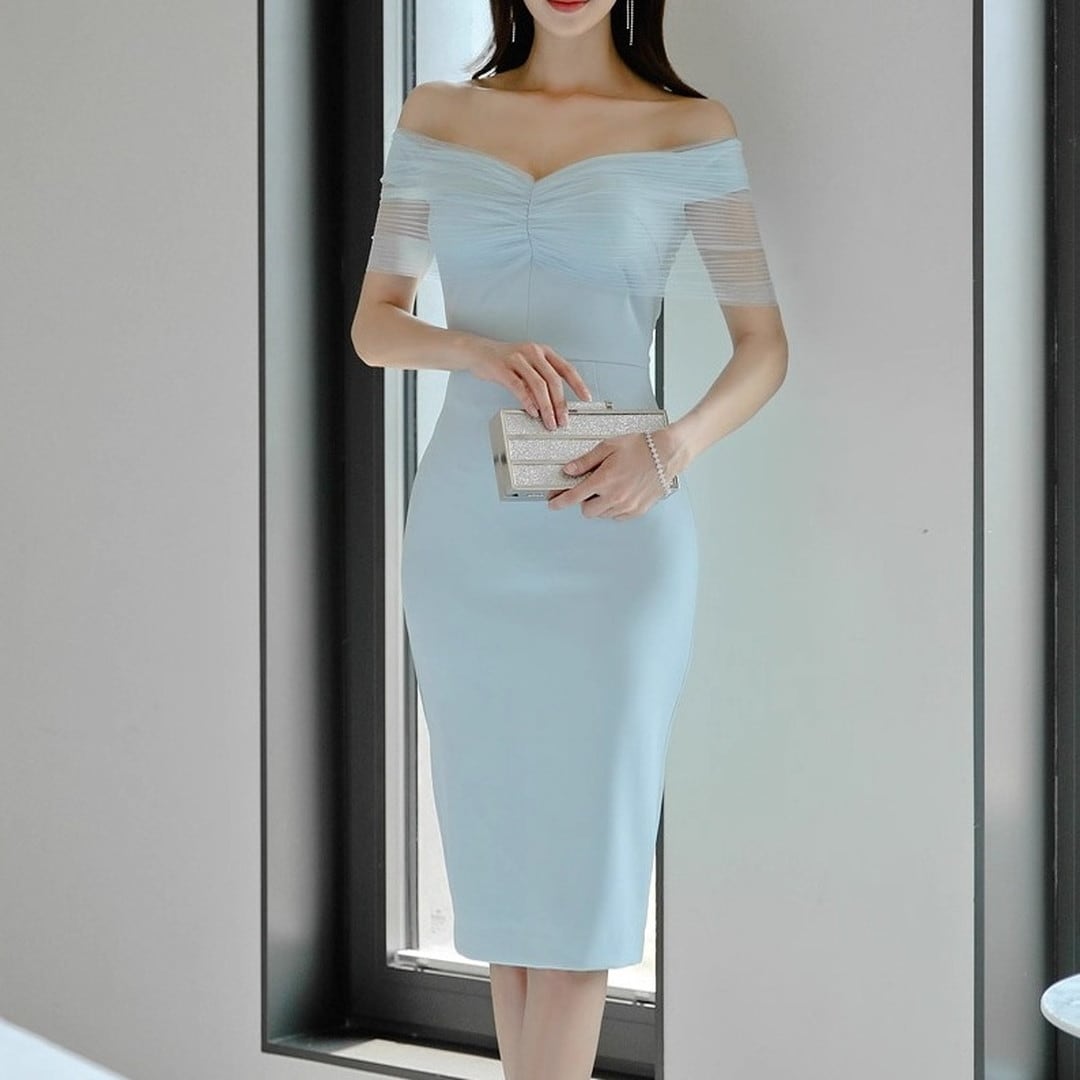 エレガントなオフショルダーデザインが魅力的なタイトドレス。