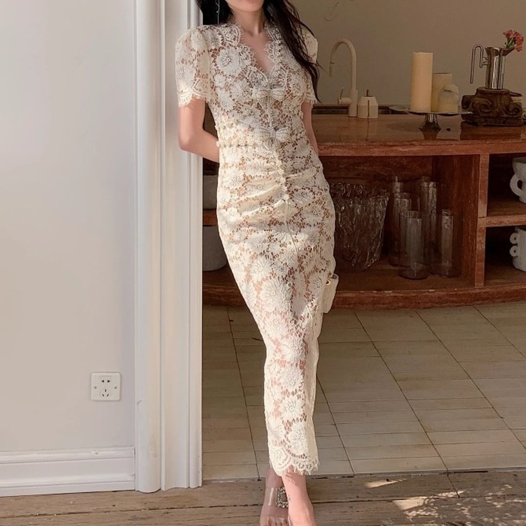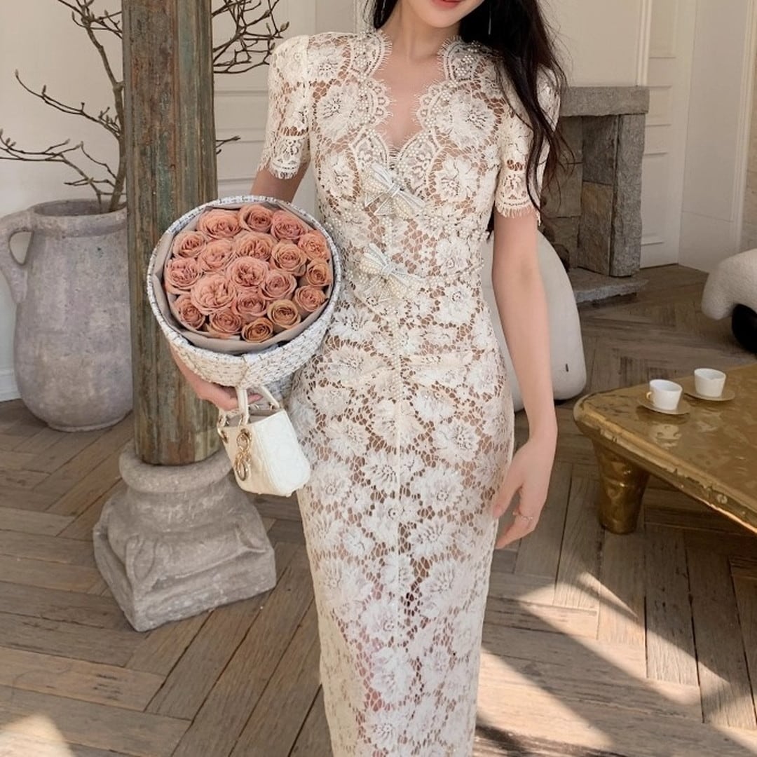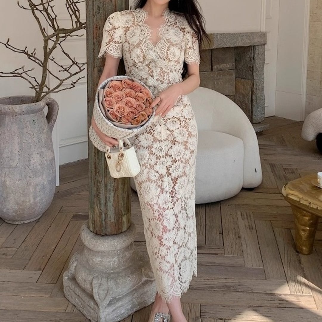 Vネックとフレンチスリーブが魅力的なミディ丈ドレス。繊細なレースが、女性らしい優美さを際立たせます。上品なデザインは、華やかなシーンに最適です。シルエットを美しく見せる絶妙な丈感もポイント。一枚で着映えする、特別なドレスをぜひお楽しみください。