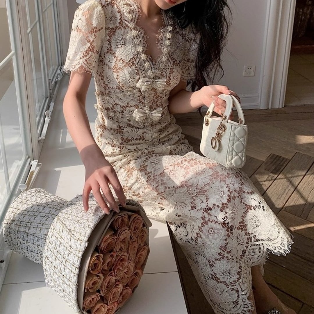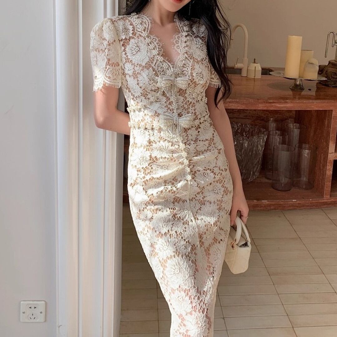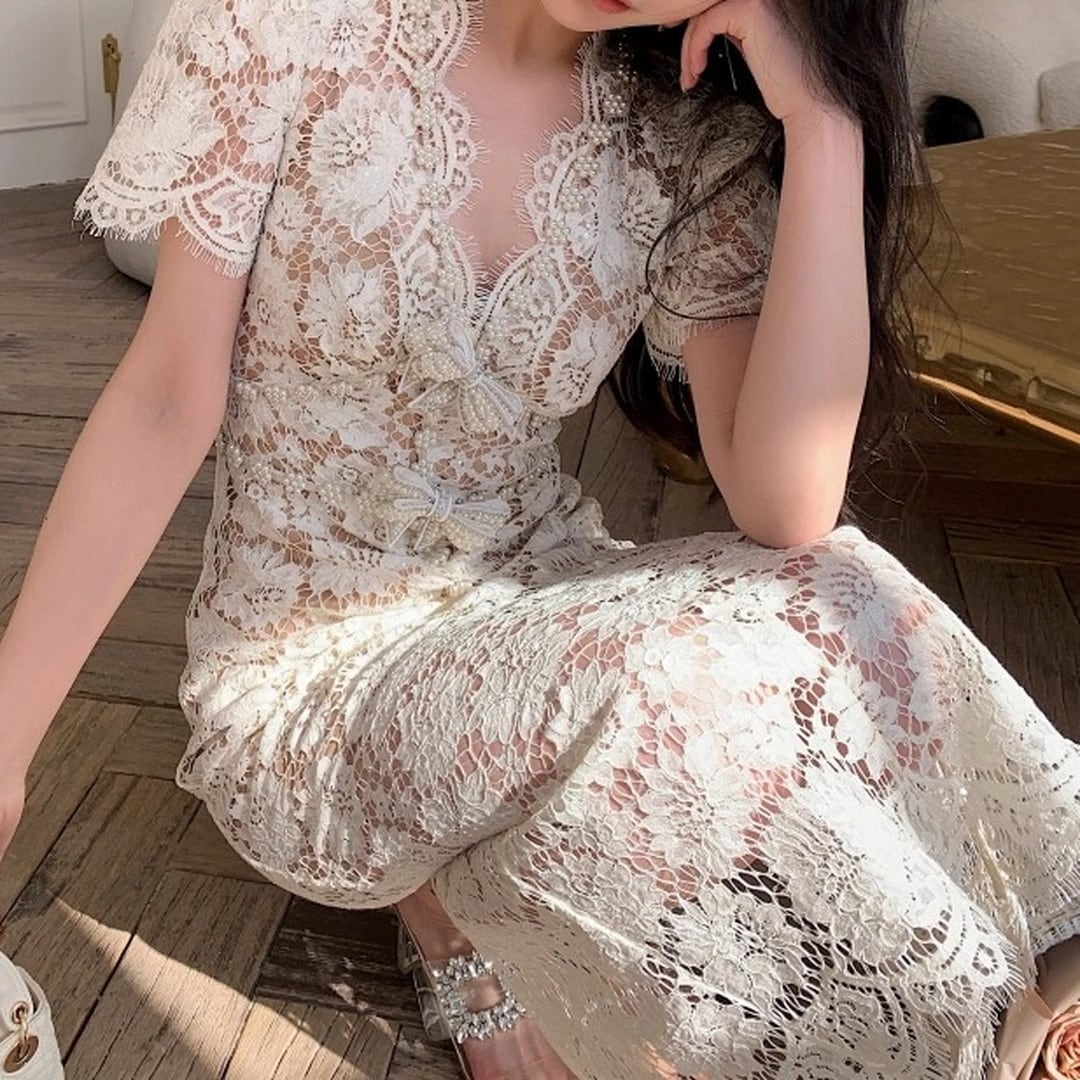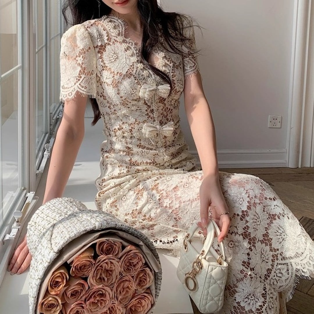 Vネックとフレンチスリーブが魅力的なミディ丈ドレス。繊細なレースが、女性らしい優美さを際立たせます。上品なデザインは、華やかなシーンに最適です。シルエットを美しく見せる絶妙な丈感もポイント。一枚で着映えする、特別なドレスをぜひお楽しみください。