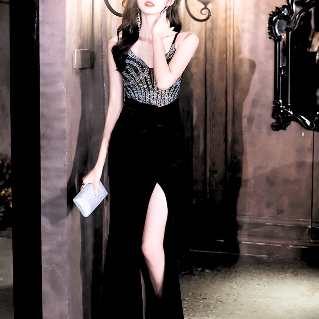 ディープVネックと、ボディラインを美しく魅せるタイトシルエットが魅力のロングドレス。胸元にはビジューが施され、華やかさをプラス。パーティーや特別な夜に、あなたを輝かせる一品です。シルエットが美しく、上品な印象を与えます。特別な日の装いに最適です。