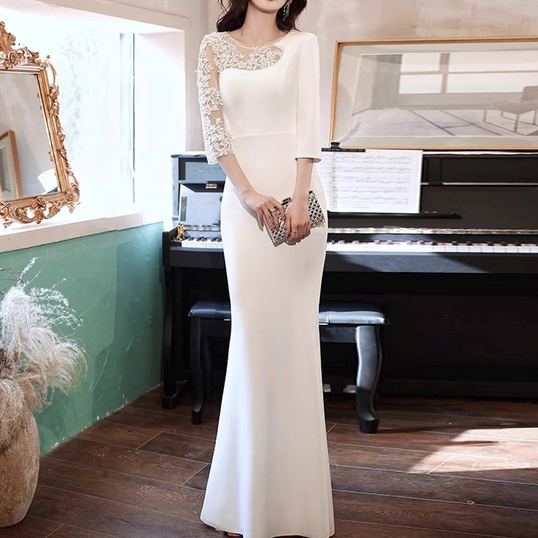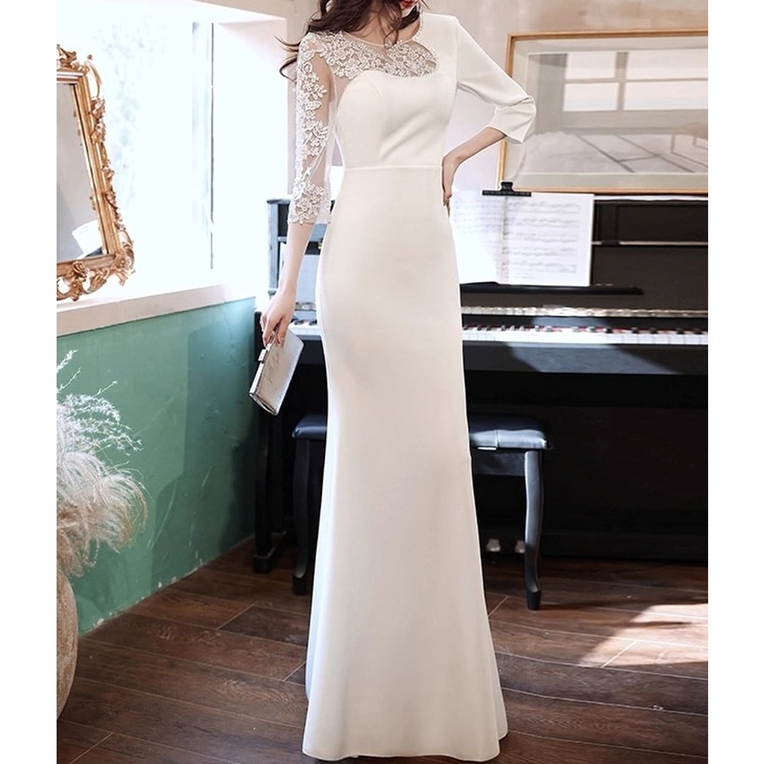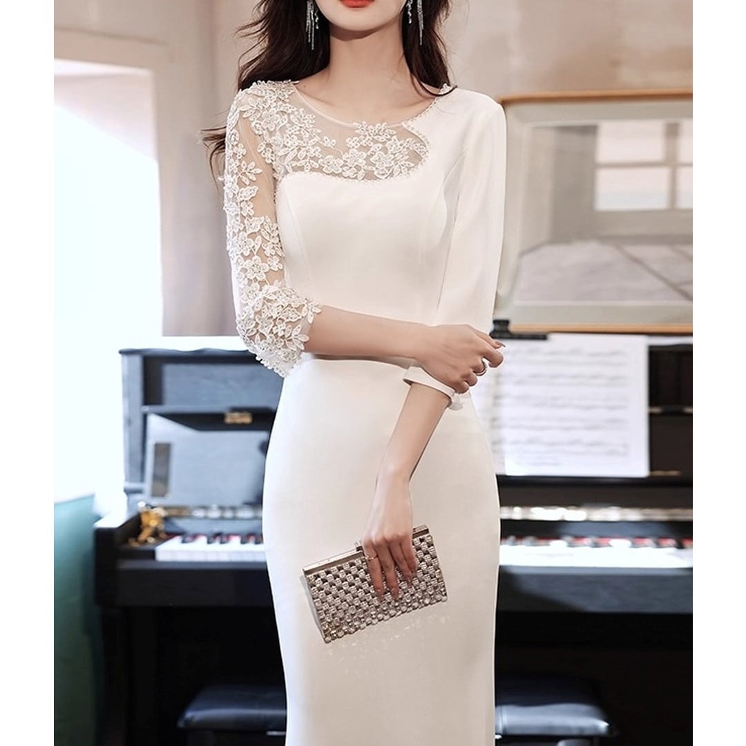 繊細なレースが魅力のロングドレス。五分袖のレース部分は、上品な透け感と華やかさを演出します。マーメイドスカートは、女性らしいボディラインを美しく魅せ、特別な日の装いを格上げします。結婚式やパーティー、フォーマルなシーンに最適です。自信に満ちたあなたをさらに輝かせる、一枚です。