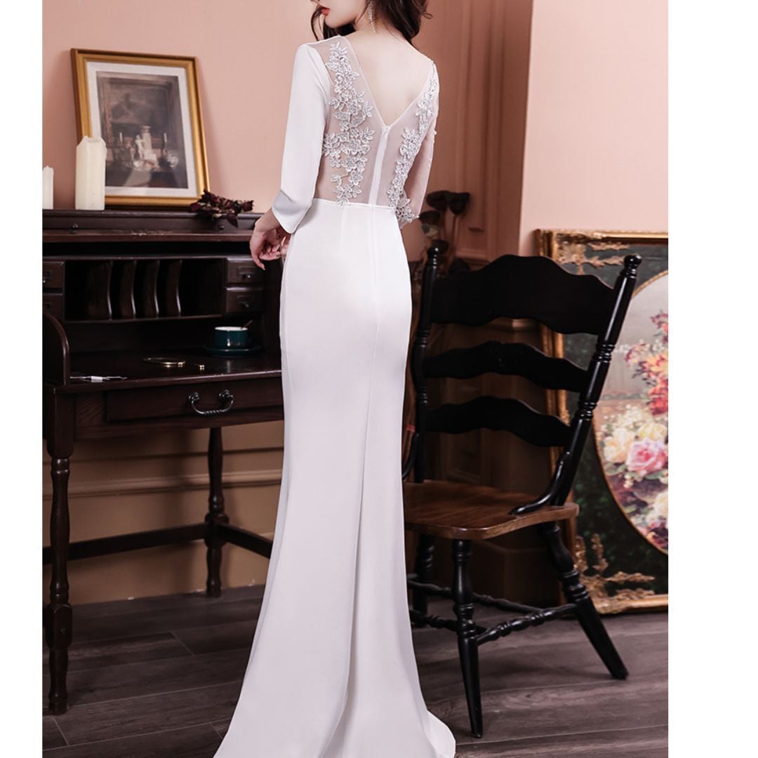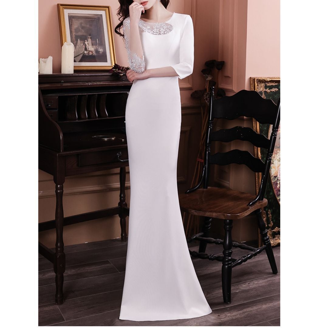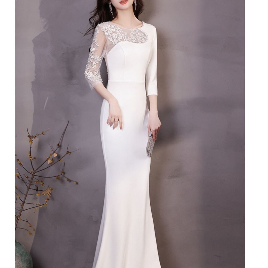 繊細なレースが魅力のロングドレス。五分袖のレース部分は、上品な透け感と華やかさを演出します。マーメイドスカートは、女性らしいボディラインを美しく魅せ、特別な日の装いを格上げします。結婚式やパーティー、フォーマルなシーンに最適です。自信に満ちたあなたをさらに輝かせる、一枚です。