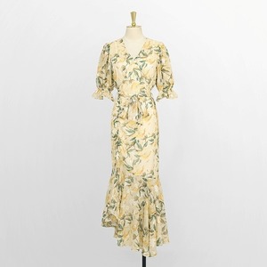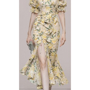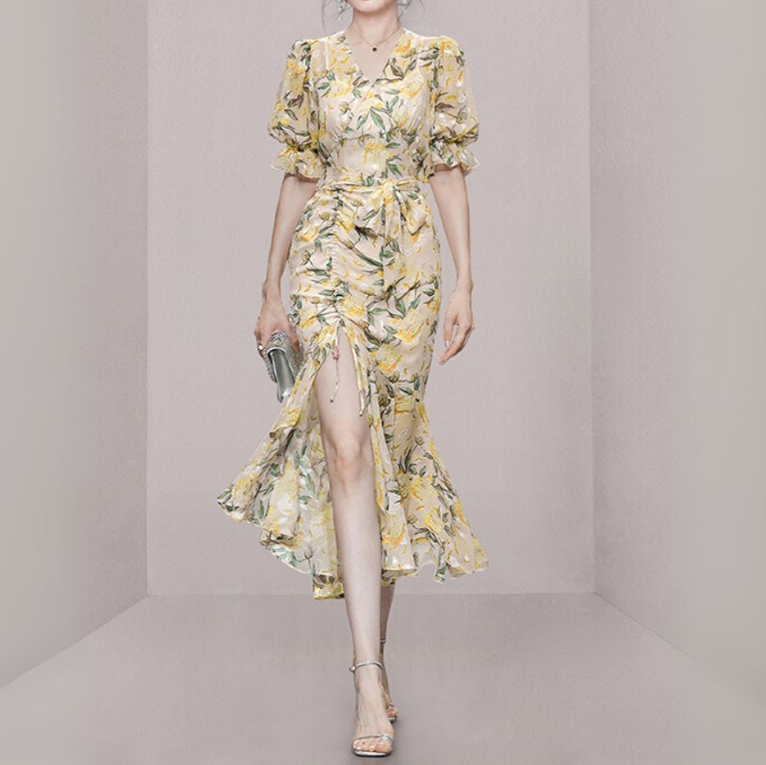 Vネックデザインとパフスリーブが女性らしさを引き立て、美しいフィッシュテールシルエットが、歩くたびに優雅さを演出します。