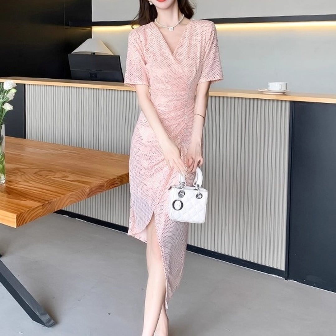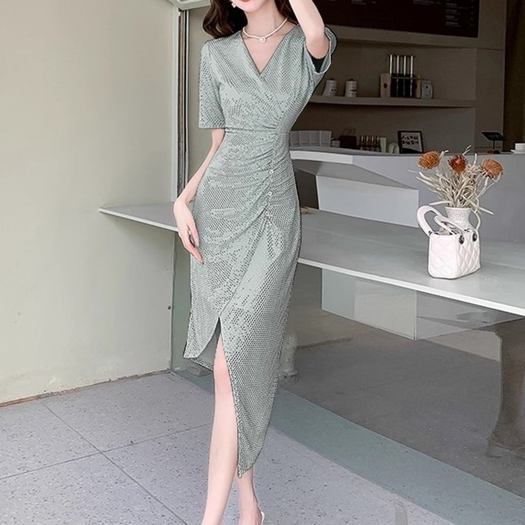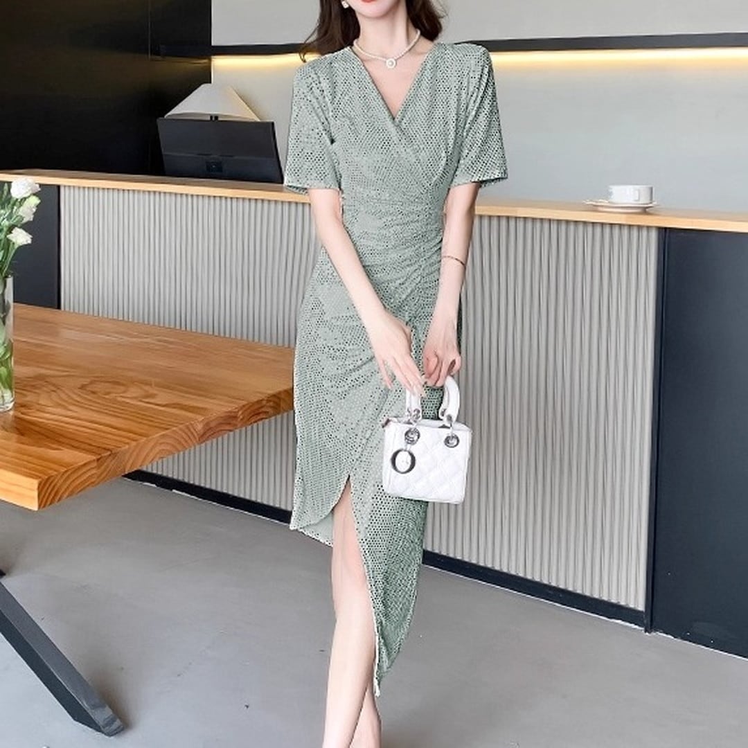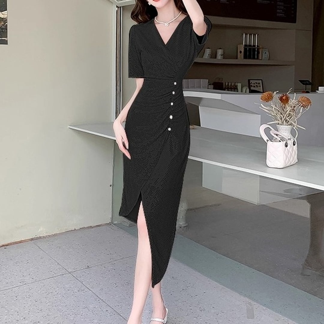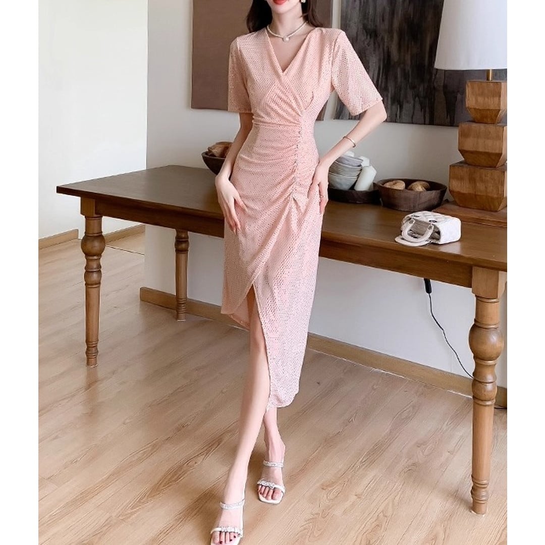 Vネックと七分袖が女性らしいシルエットを演出するラップドレス。ミディ丈のプリーツとスリットが、上品さと遊び心を両立したデザインです。ウエストのボタンがアクセントとなり、スタイルアップ効果も期待できます。パーティーや特別な日の装いに最適です。