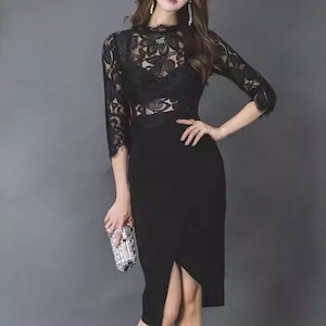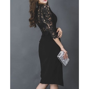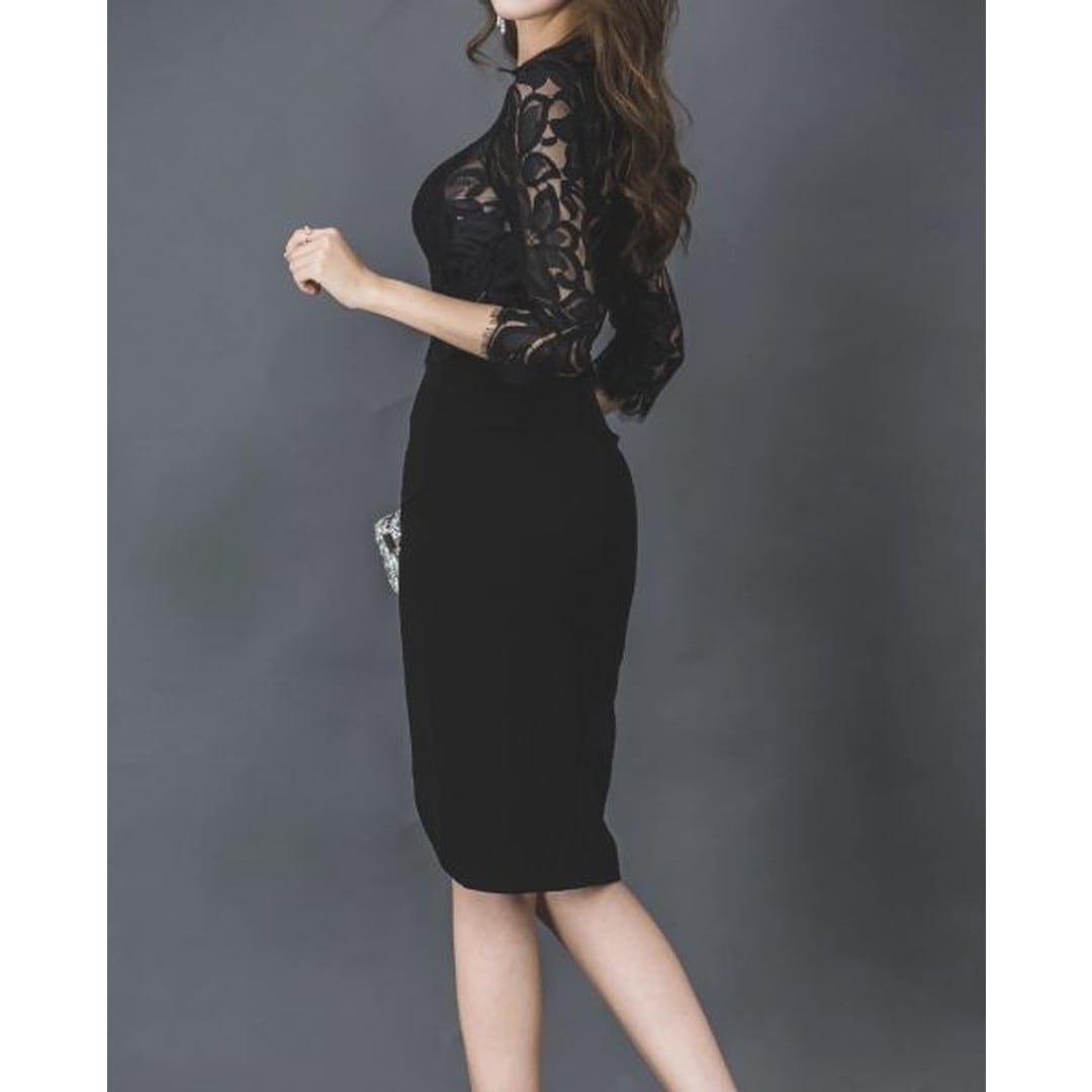 洗練された七分袖ハイネックのレースワンピース。膝丈のシルエットが上品さを際立たせ、どんなシーンにも対応できる万能アイテムです。繊細なレースの上品さと、すっきりとしたシルエットの組み合わせは、女性らしさを最大限に引き立てます。パーティーやデートはもちろん、特別な日の装いにも最適です。