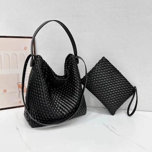 イントレチャート風の編み込みデザインが特徴的なショルダーバッグ。上品なカラーリングと洗練されたフォルムが、どんなスタイルにもすんなり馴染みます。コンパクトなポーチもセットになっているので、お財布やスマートフォンなど、必要な小物を分けて収納できます。デイリーユースはもちろん、ちょっとしたお出かけにも最適なアイテムです。