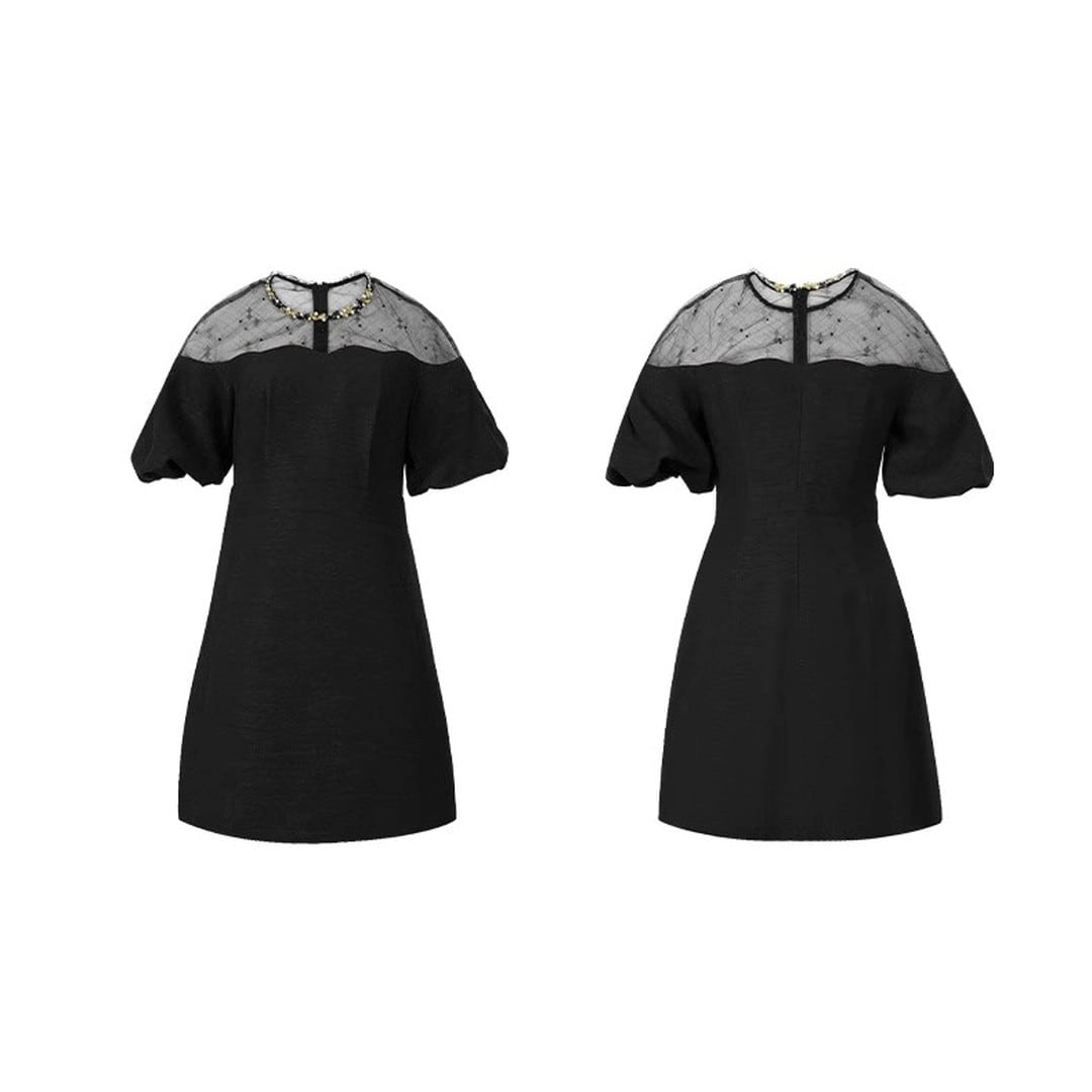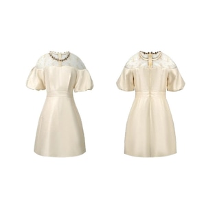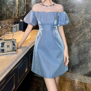 オフショルダーとシアーなヨークが魅力的なAラインミニドレス。