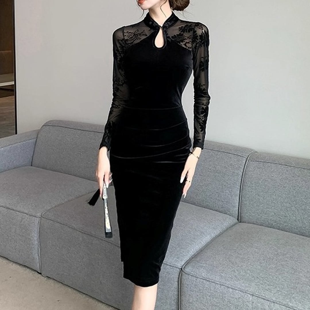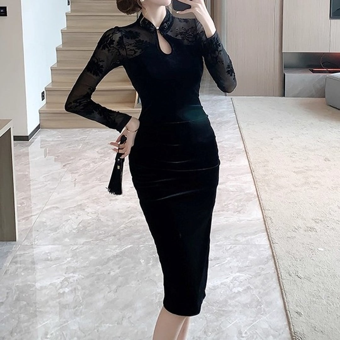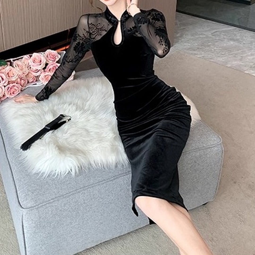 チャイナドレス風で女性らしいボディラインを美しく魅せ、膝丈のスリットが動きやすさと
