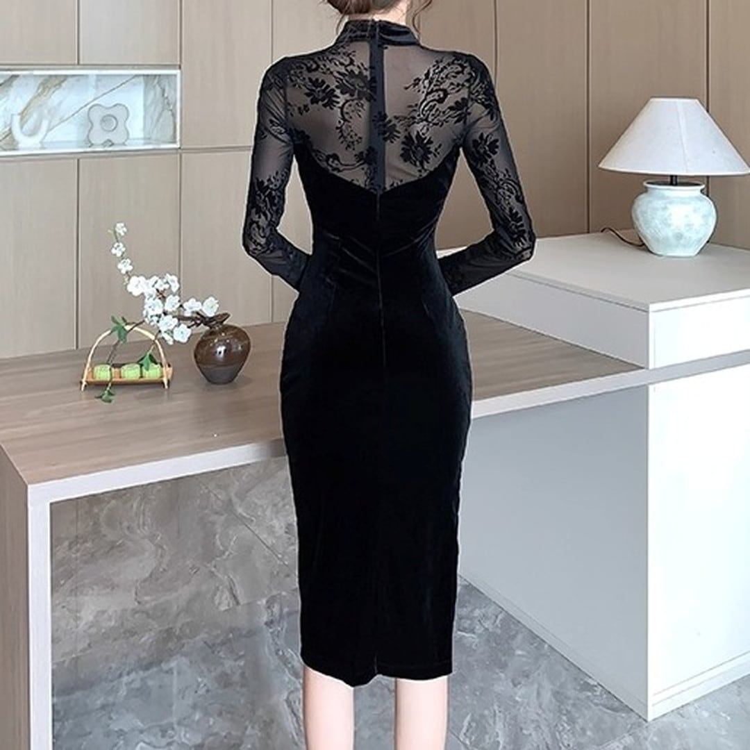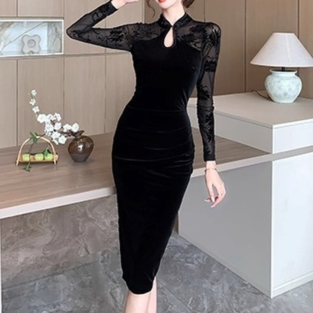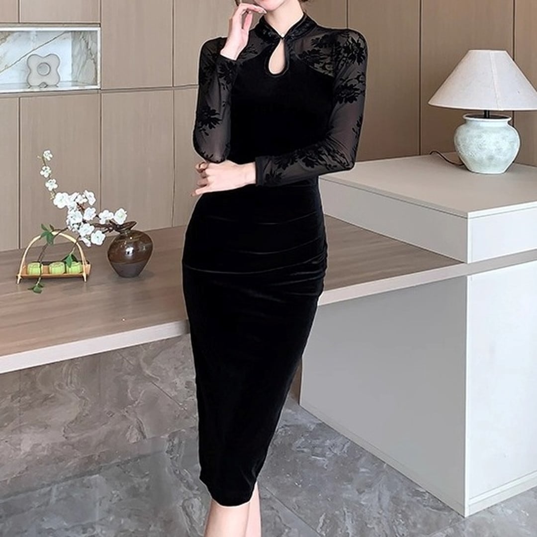 チャイナドレス風で女性らしいボディラインを美しく魅せ、膝丈のスリットが動きやすさと
