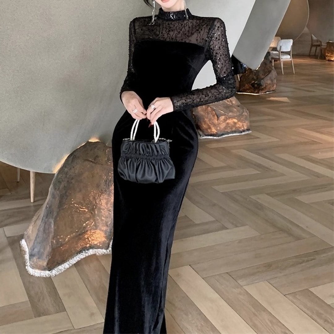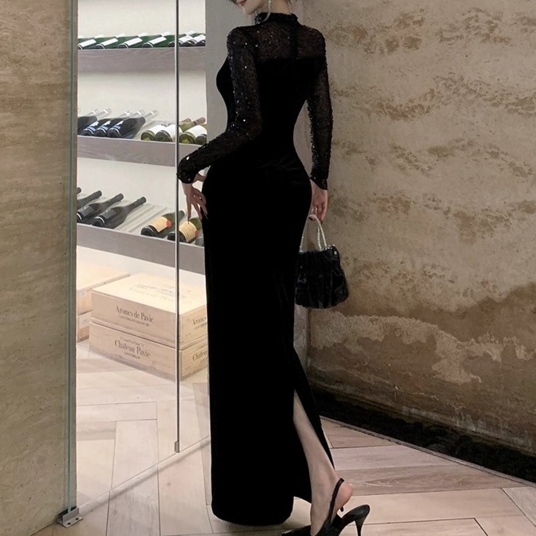 絶妙な透け感が魅力的なドレス。スタンドカラーとレース仕立ての肩が、大人の女性らしさを演出します。