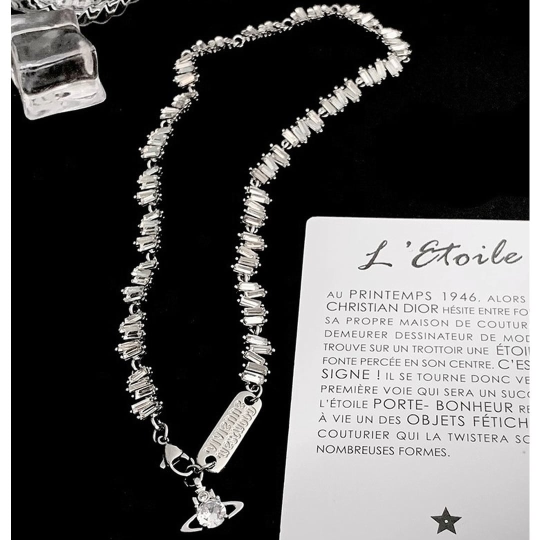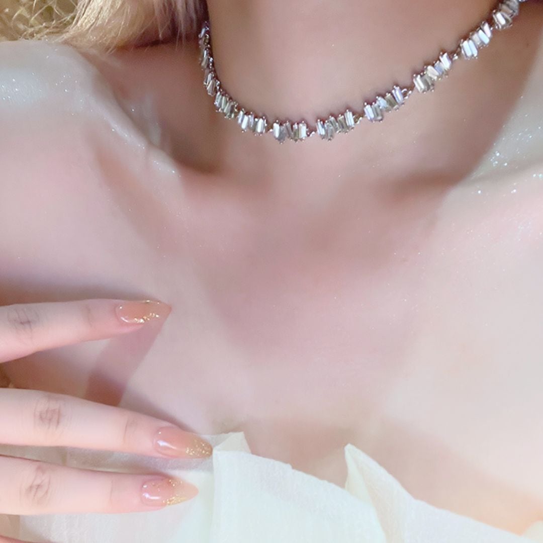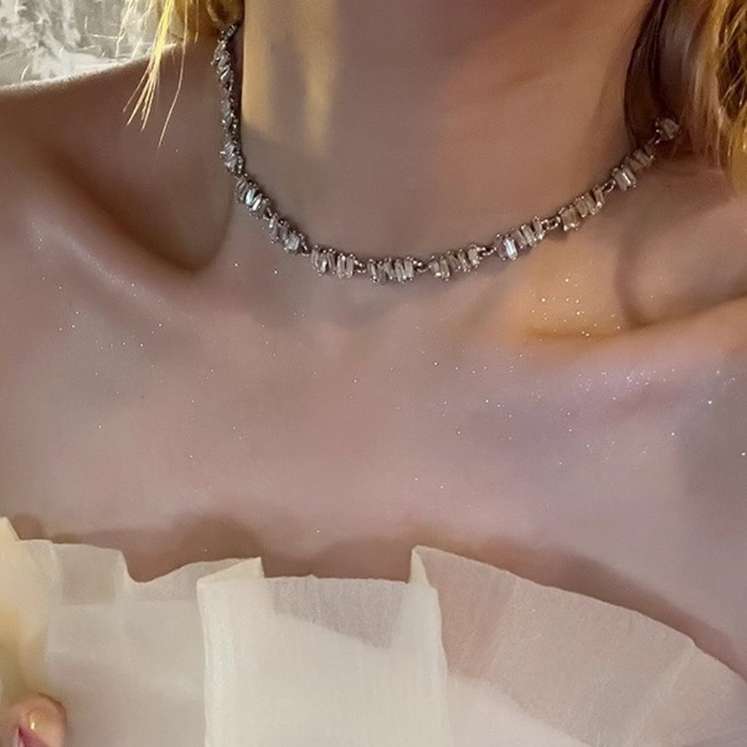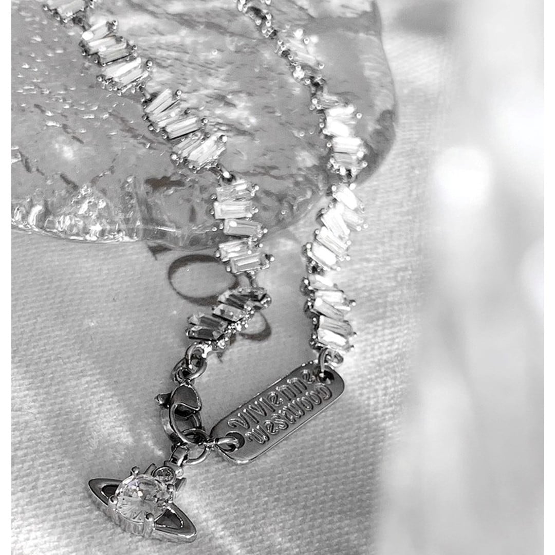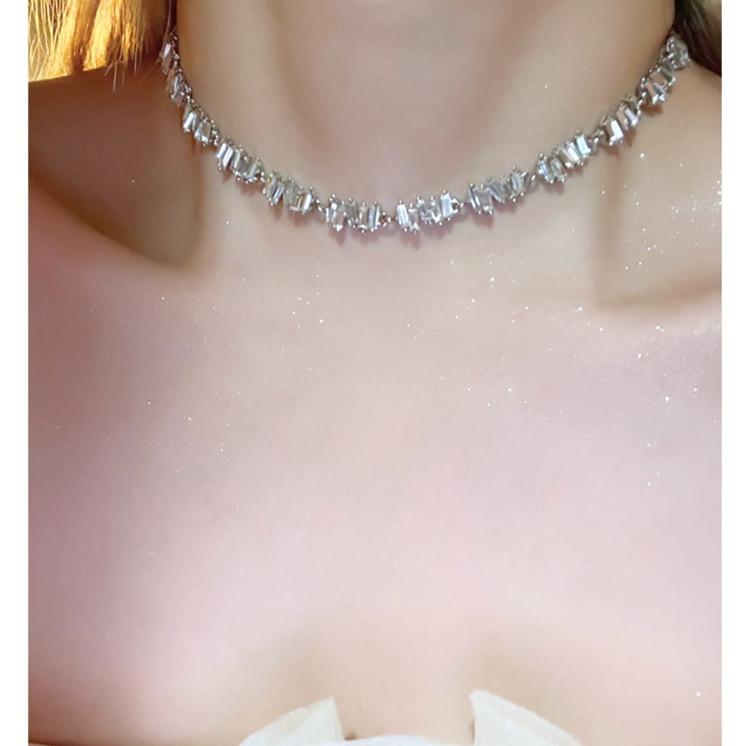 首元に輝きをプラス。ラインストーンが連なったチョーカーネックレスは、シンプルな装いに華やかさを添えます。パーティーシーンはもちろん、普段使いのカジュアルなスタイルにも、上品なアクセントとして活躍します。