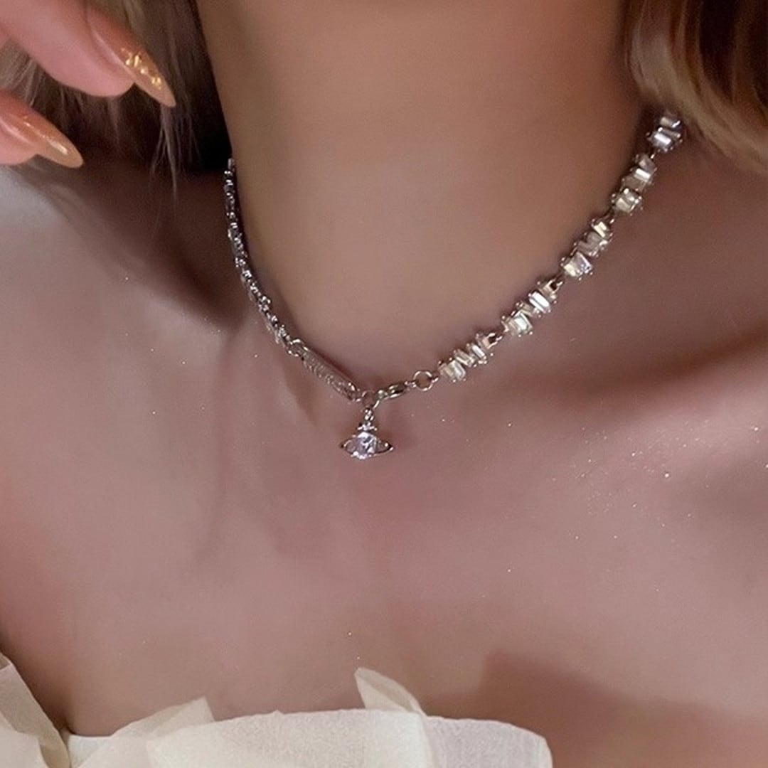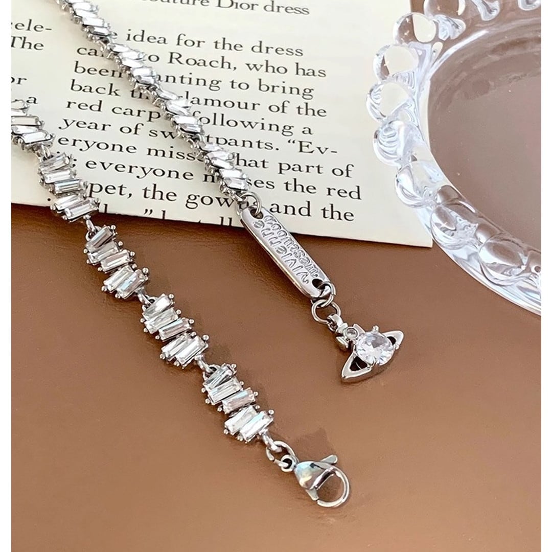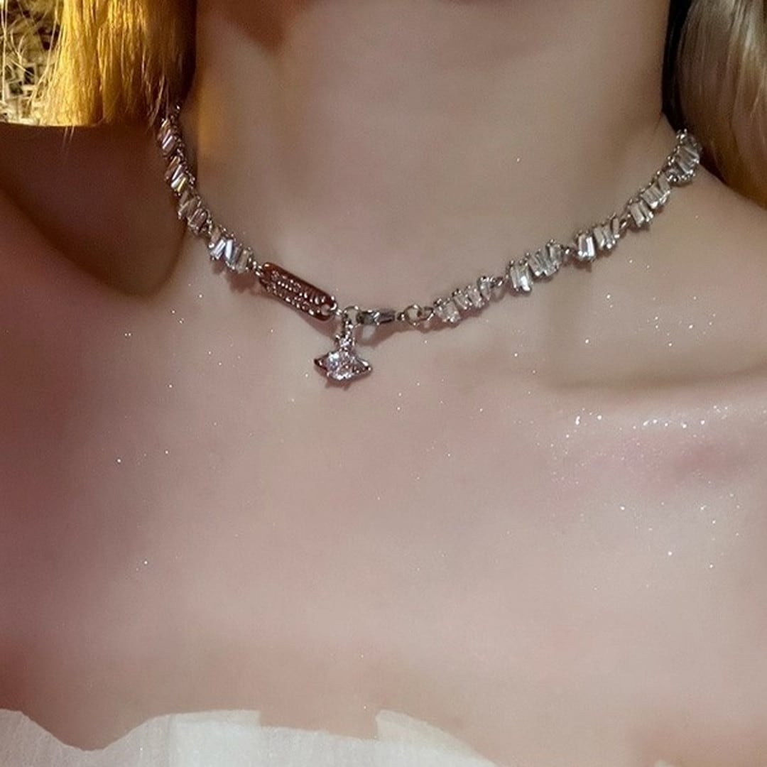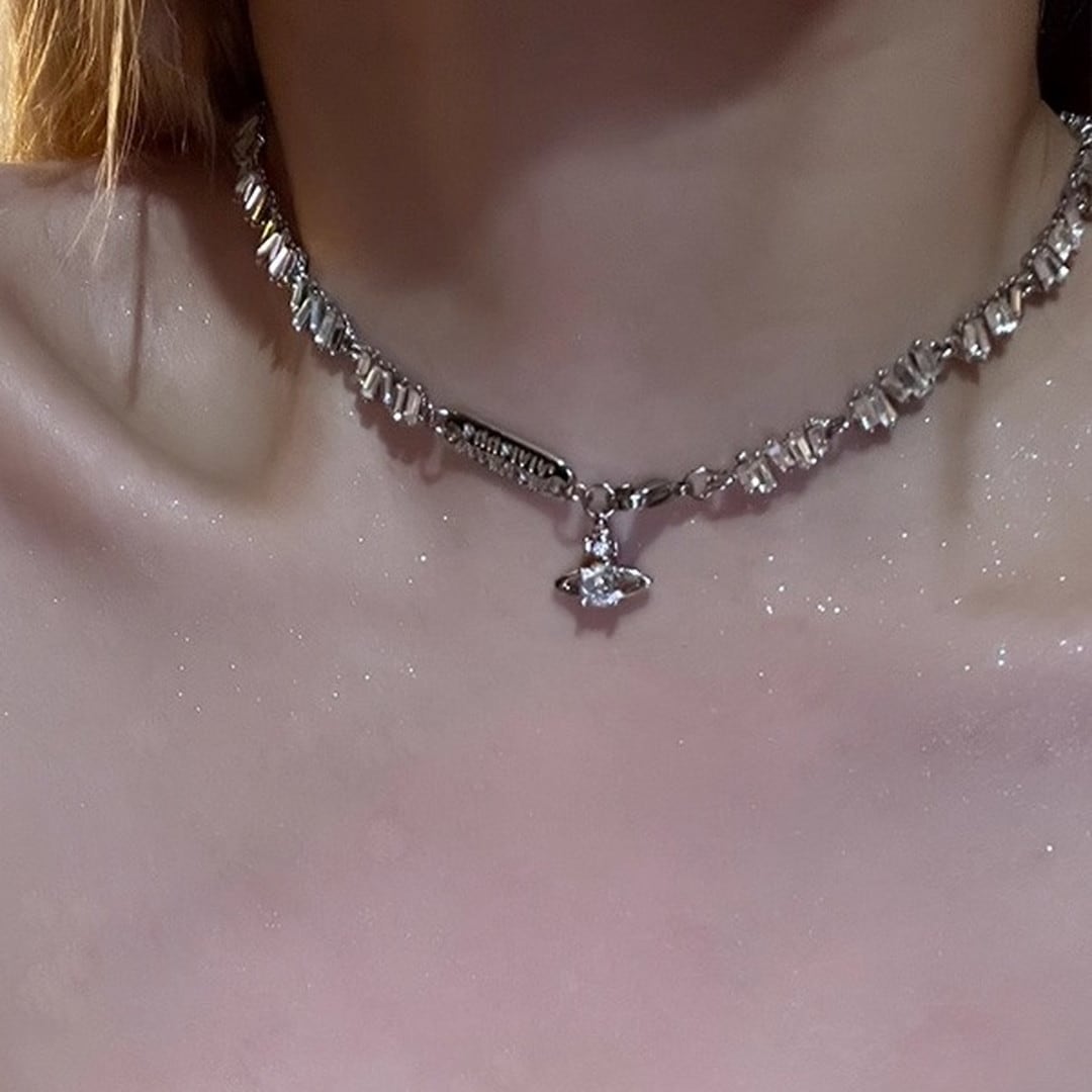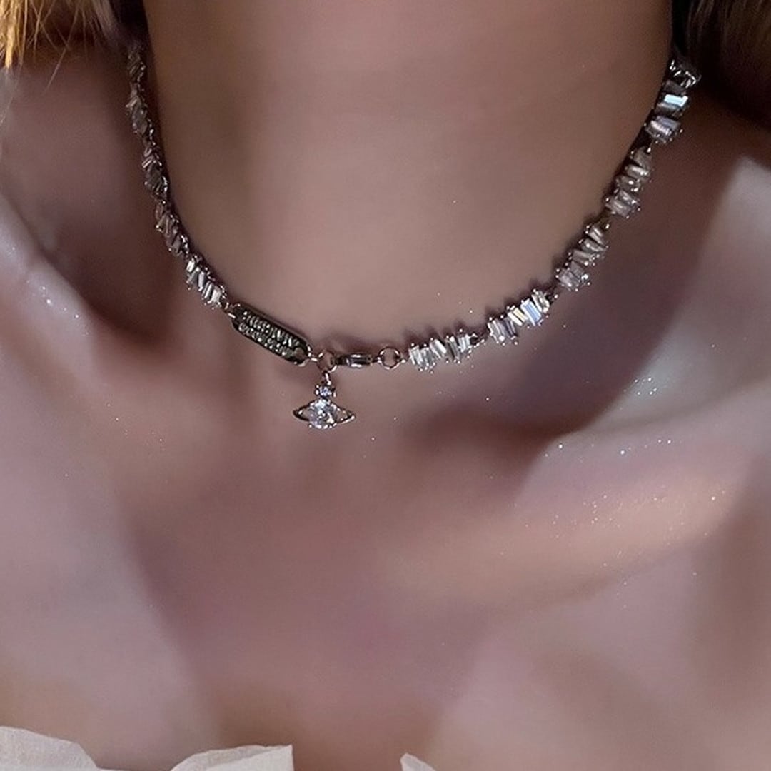 首元に輝きをプラス。ラインストーンが連なったチョーカーネックレスは、シンプルな装いに華やかさを添えます。パーティーシーンはもちろん、普段使いのカジュアルなスタイルにも、上品なアクセントとして活躍します。