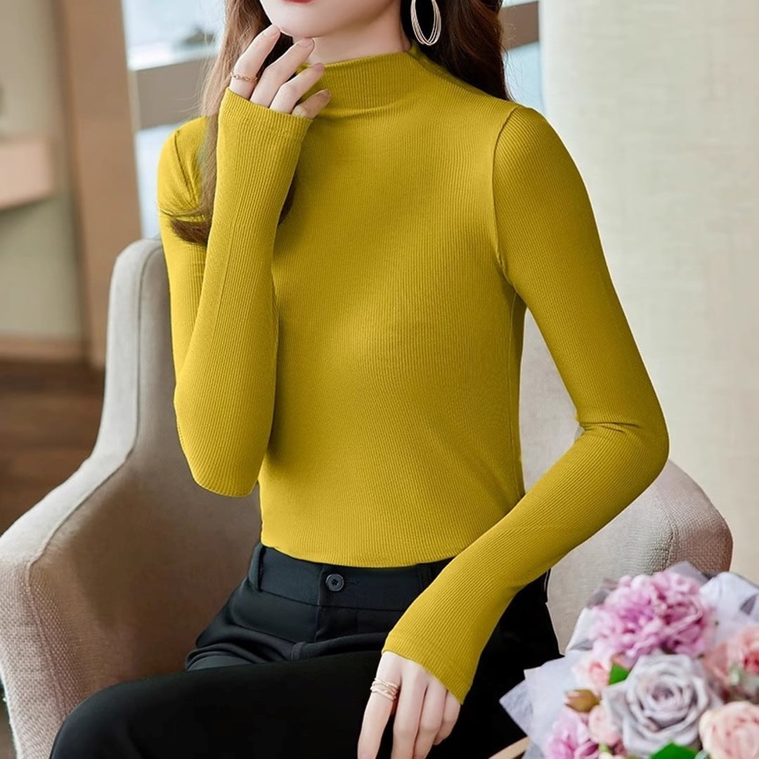 リブ編みが特徴的な、スリムフィットの長袖モックネックTシャツ。