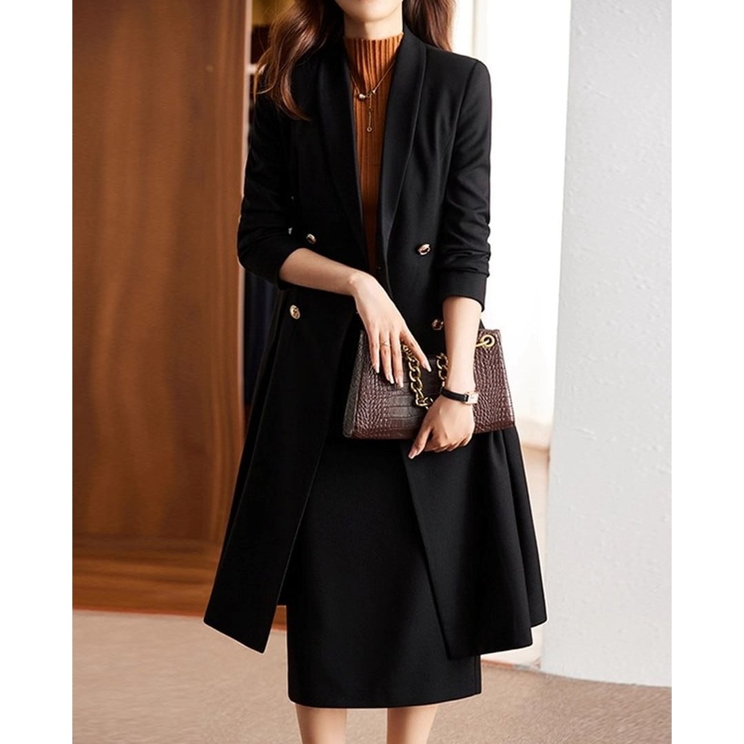 ダブルブレストが上品な印象のロングジャケット。ベルトでウエストマークすれば、スタイルアップ効果も期待できます。オフィスシーンはもちろん、普段使いにも合わせやすいデザインです。