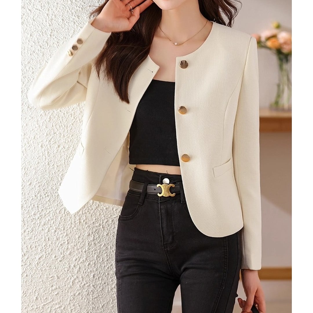 ノーカラーで首元をすっきりと見せてくれるジャケット。ヒップにかかる丈感で、スタイルアップ効果も期待できます。ボタンを留めてきちんと感を演出したり、前を開けてカジュアルに着こなしたり、様々なシーンで活躍します。オフィススタイルから、ちょっとしたお出かけまで、幅広く活用できる一枚です。
