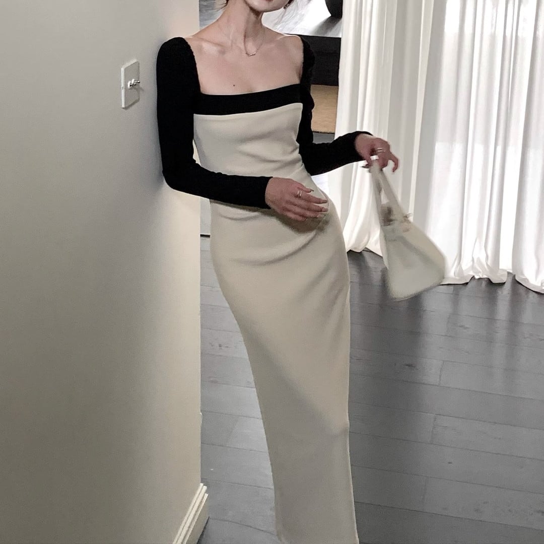 バイカラーデザインが目を引く、長袖マキシドレス。スクエアネックがデコルテを美しく演出し、上品な印象を与えます。落ち着いた配色なので、ちょっとしたお呼ばれやパーティーシーンにもおすすめです。アクセサリーやバッグを合わせることで、さらに華やかな着こなしをお楽しみいただけます。