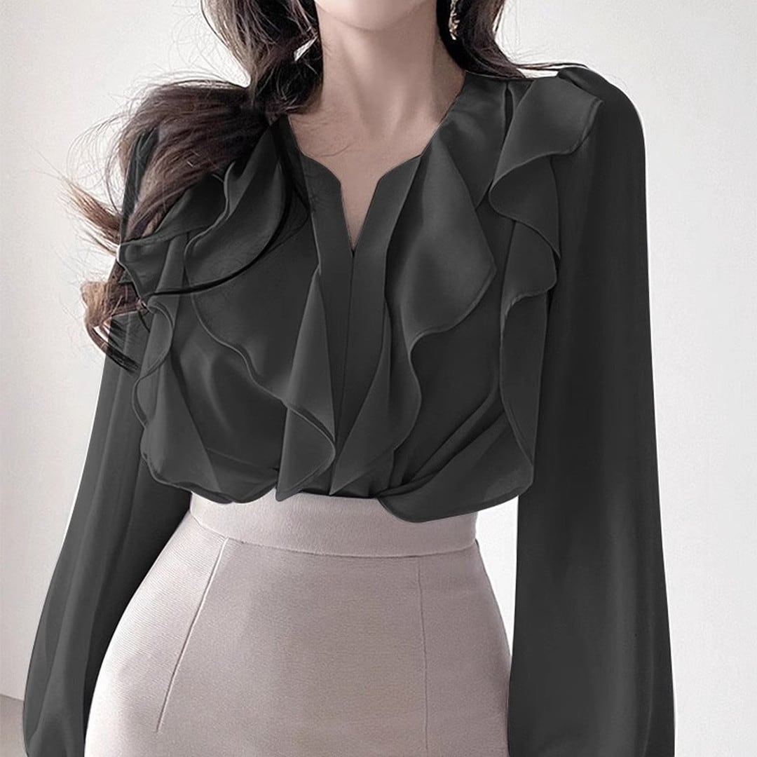 Vネックとフリルが上品な印象を与える長袖ブラウス。オフィスシーンはもちろん、パーティーなどの華やかな場にもおすすめです。袖口にもフリルがあしらわれており、さりげない可愛らしさを演出します。スカートやパンツスタイルにも合わせやすい着回し力抜群のアイテムです。