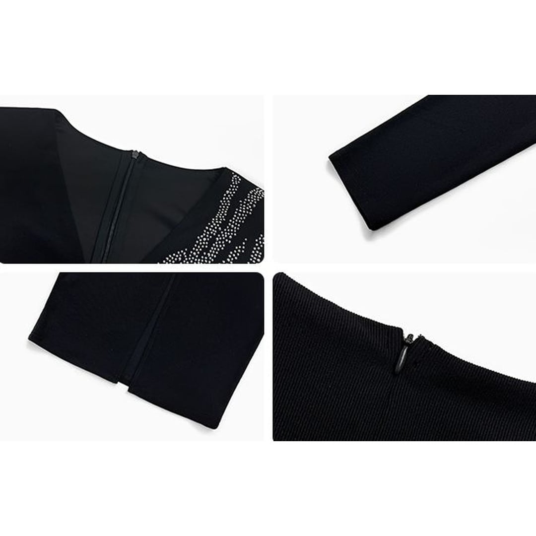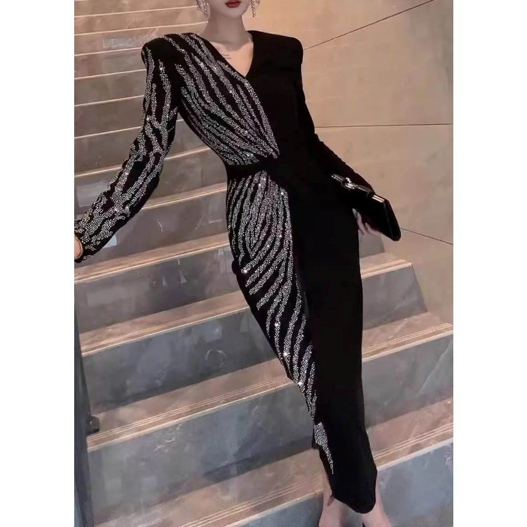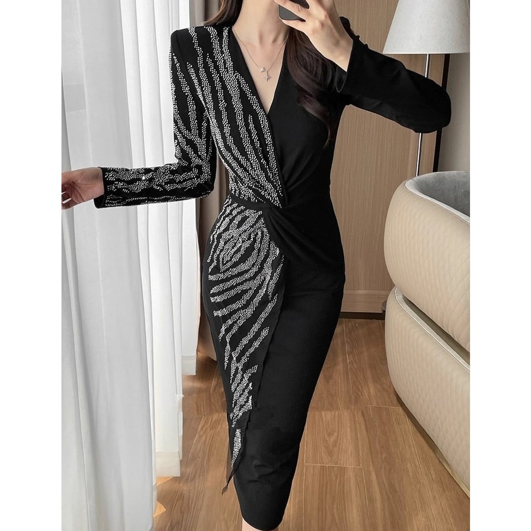 ラップスタイルが特徴的な長袖ミディドレス。アシンメトリーなドレープが美しく、ボディラインを綺麗に見せてくれます。華やかな装飾が施されており、パーティーシーンや特別な日の装いに最適です。落ち着いたカラーなので、アクセサリーや小物で個性を演出できます。