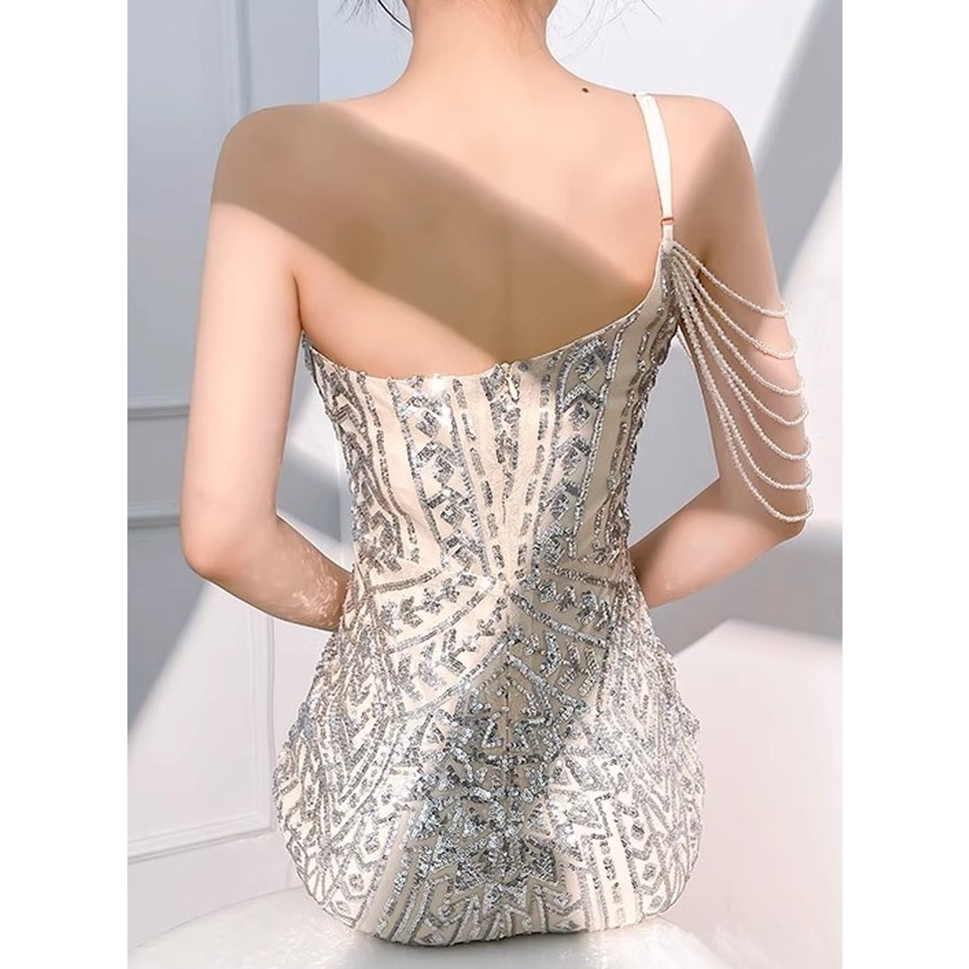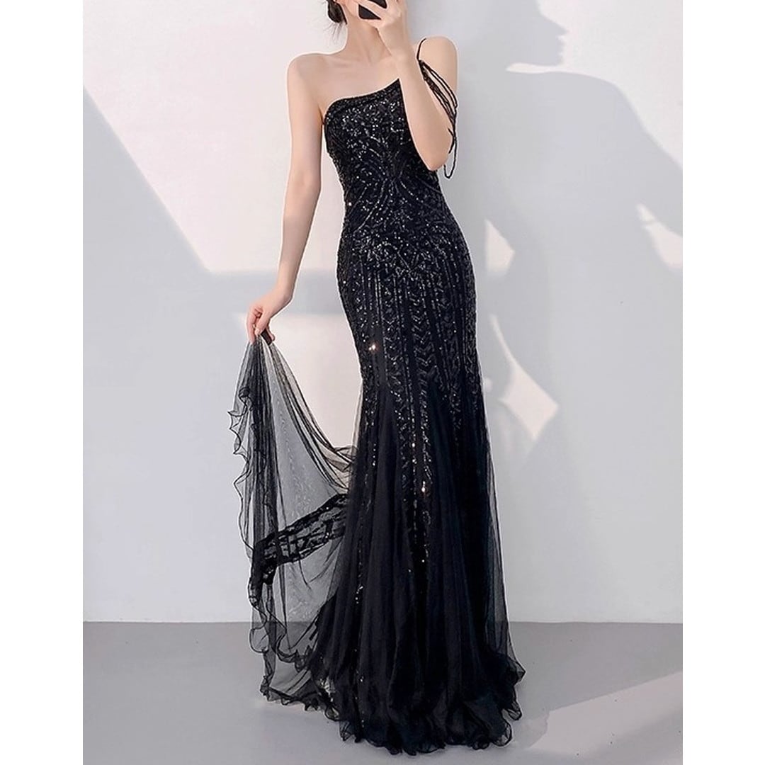 特別な夜にふさわしい、美しいマキシ丈イブニングドレスです。ワンショルダーのデザインが、洗練された大人の女性らしさを引き立てます。全体に施されたビーズ装飾は、光を浴びて輝き、周囲の目を引くことでしょう。パーティーやイベントで、あなたを主役にする一着です。