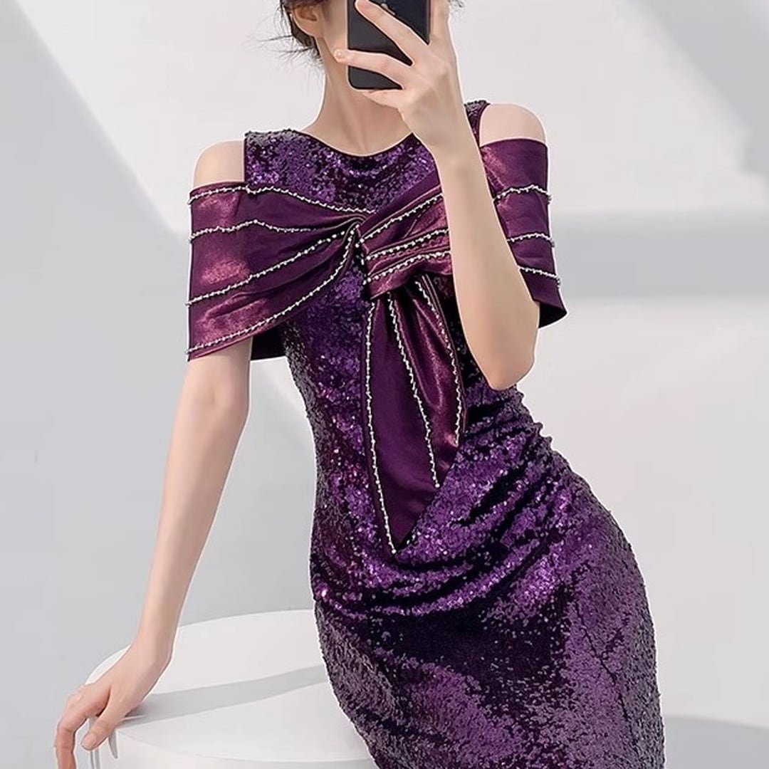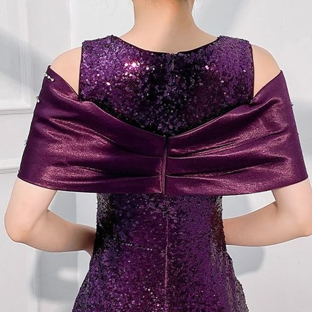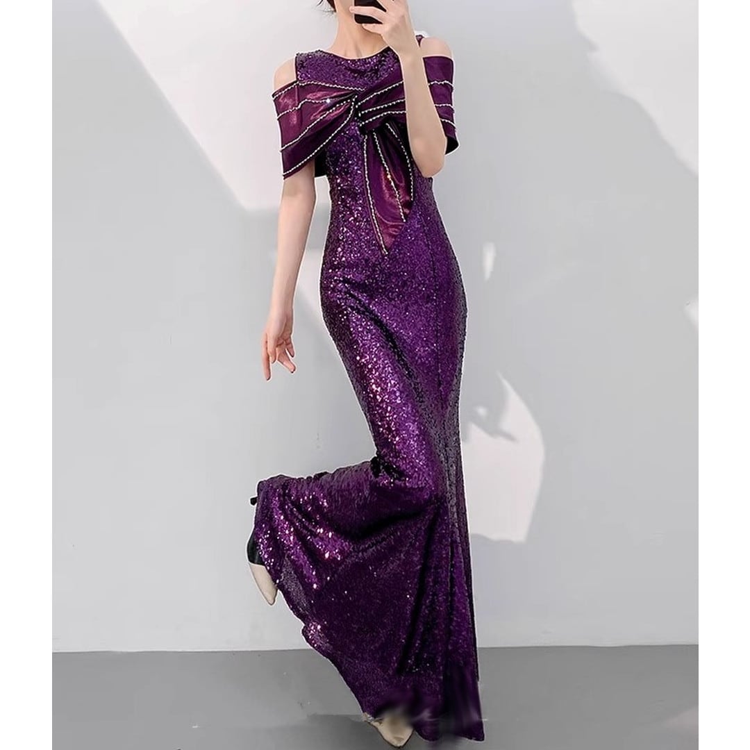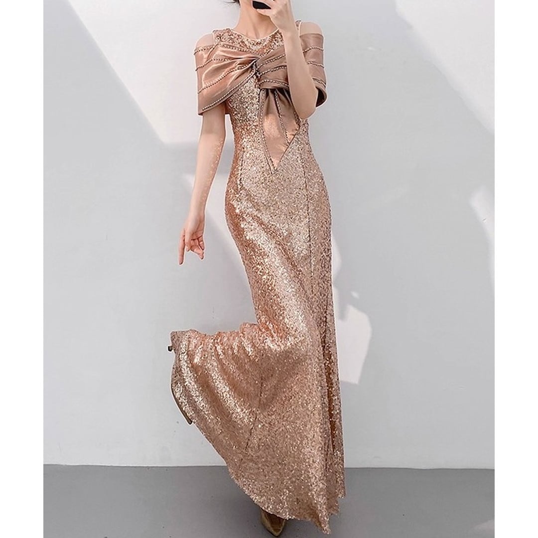 特別な日に華を添える、ミディ丈のシルエットが美しいドレスです。肩のデザインとドレープがポイントで、上品な印象を与えます。パーティーやイベントなど、様々なシーンで活躍します。