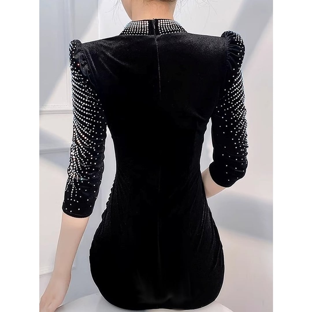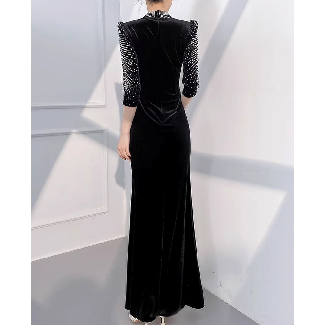 Vネックと七分袖が上品な印象を与えるミニドレス。タイトなシルエットがボディラインを美しく引き立てます。さりげないスリットが、大人の女性らしさを演出。パーティーや特別な日の装いに最適です。