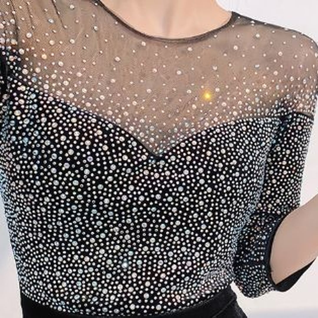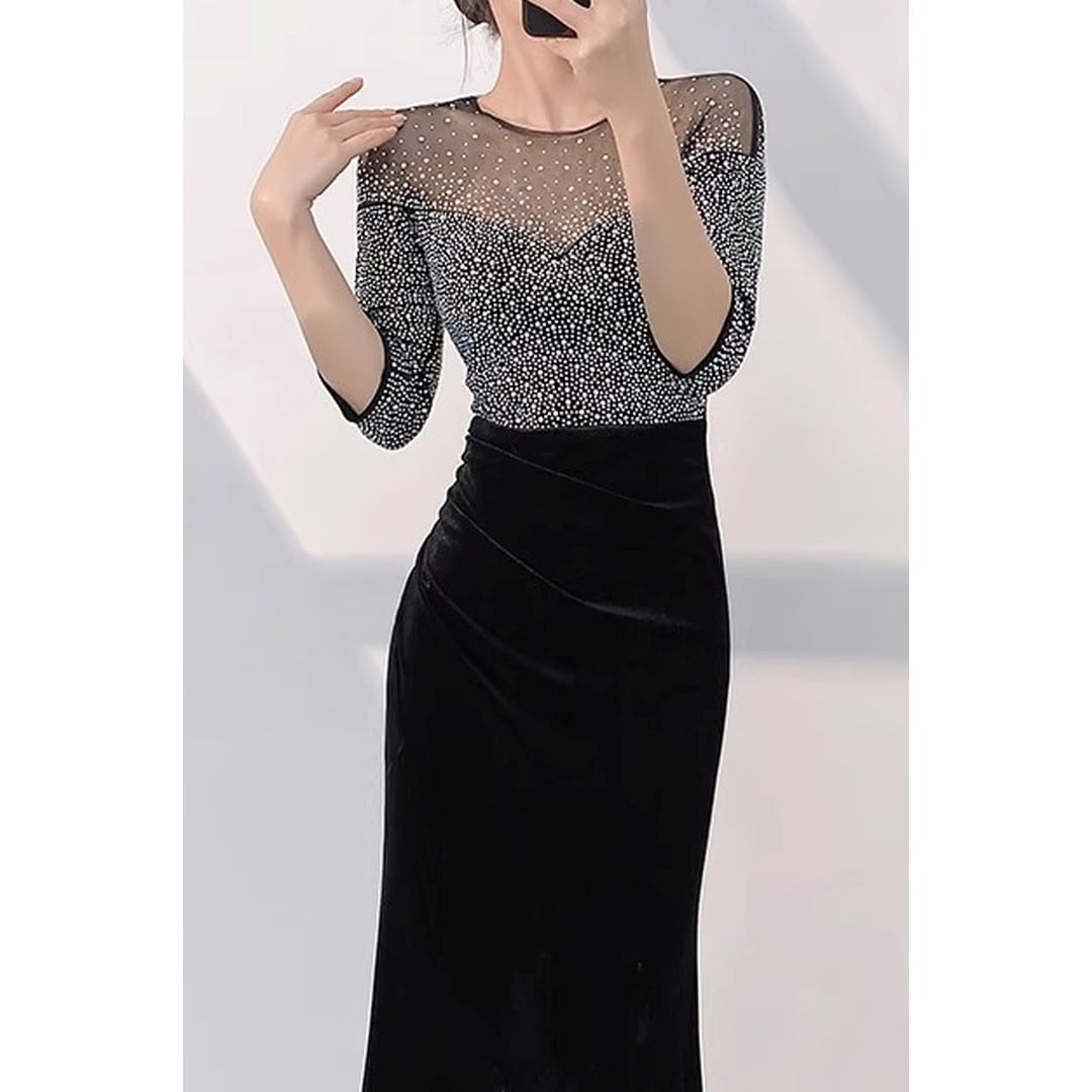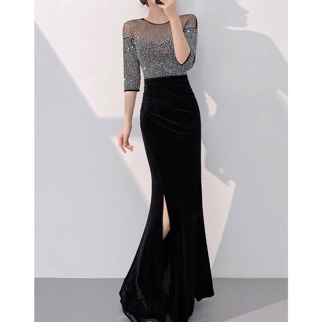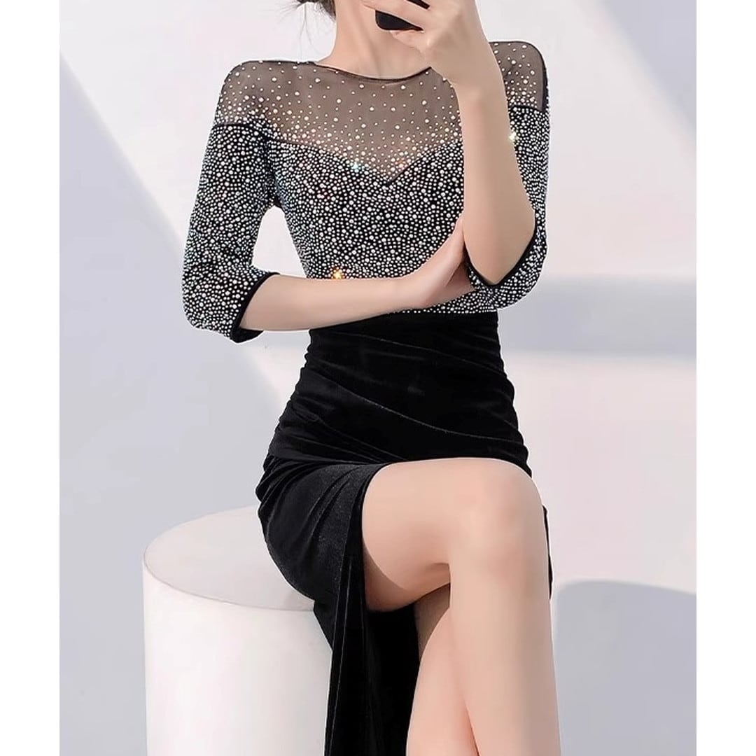 上品な装いを演出するロングドレス。七分袖が腕をほっそりと見せ、洗練された印象を与えます。スカート部分にはスリットが入っており、動きやすさとエレガントさを両立。特別な日のディナーやパーティーなど、華やかなシーンに最適です。