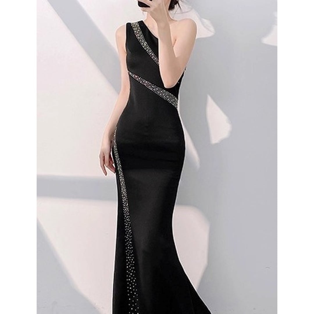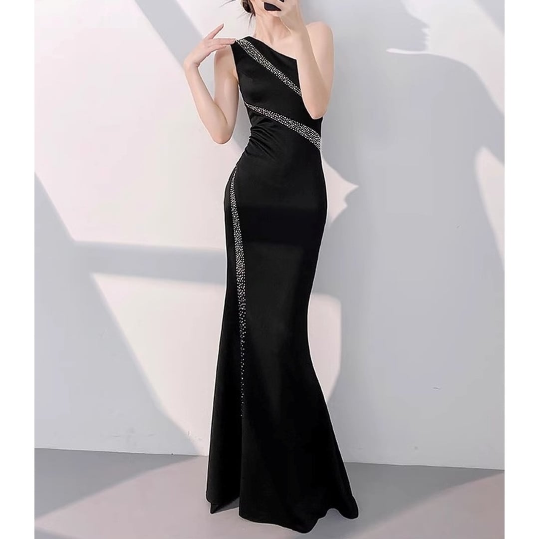 特別な夜にふさわしい、洗練されたシルエットが魅力的なドレスです。ワンショルダーのデザインが、デコルテを美しく演出し、エレガントな印象を与えます。ボディラインに沿ったマーメイドラインが、女性らしい曲線美を際立たせ、スタイルアップ効果も期待できます。パーティーやイベントなど、華やかなシーンで存在感を放つ一着です。