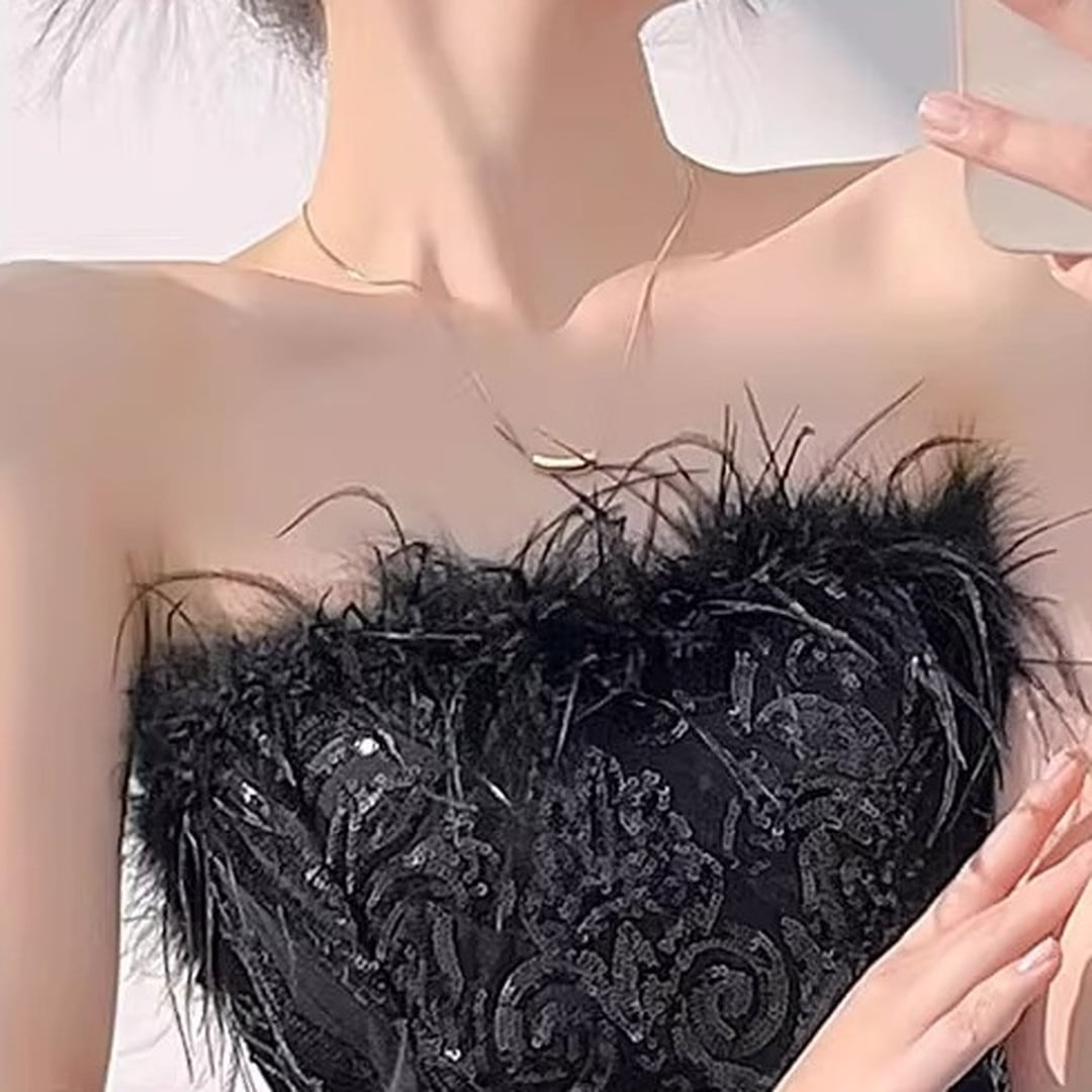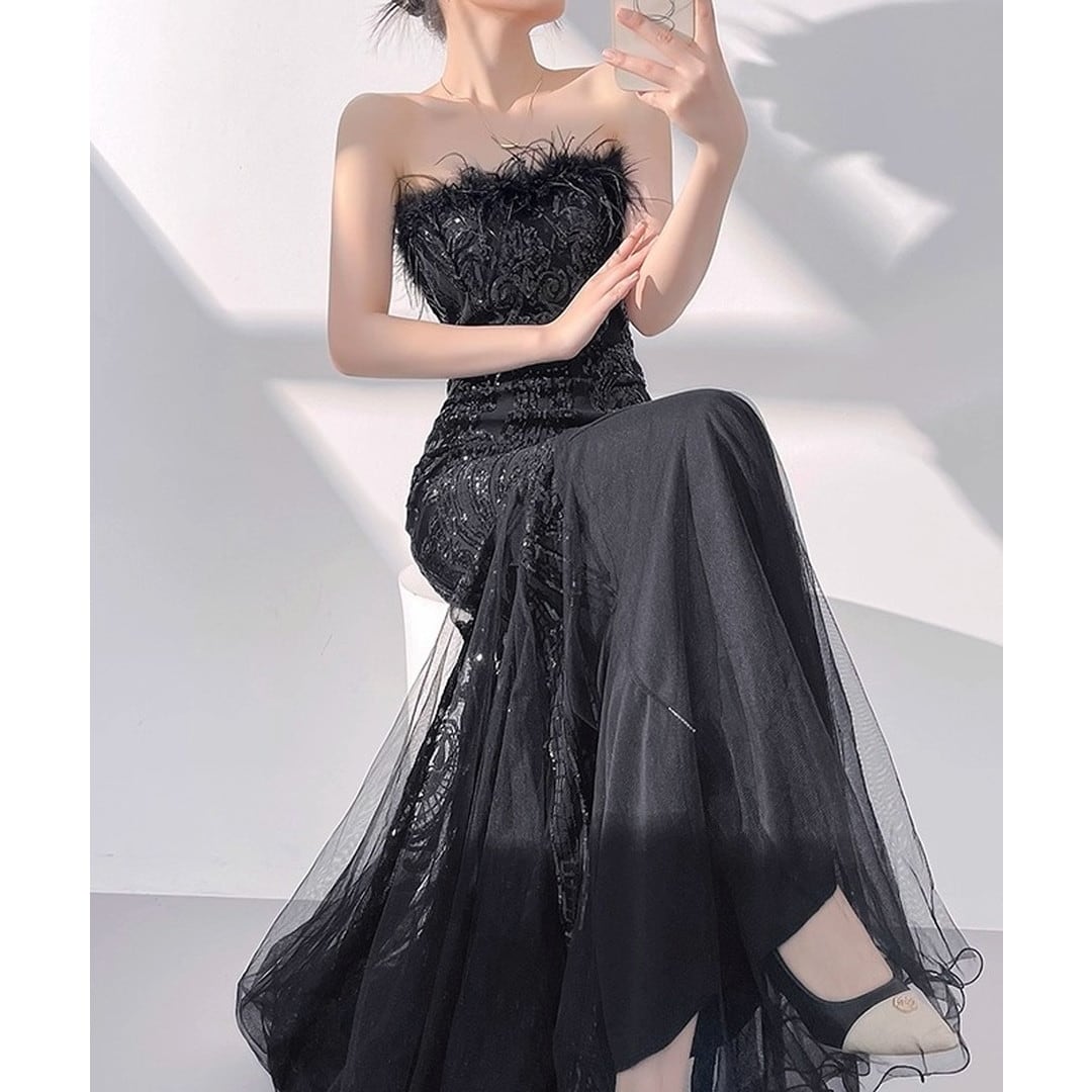 全体にスパンコールをあしらったマキシ丈のチューブトップドレス。パーティや特別なイベントで、ひときわ目を引く華やかなスタイルを演出します。