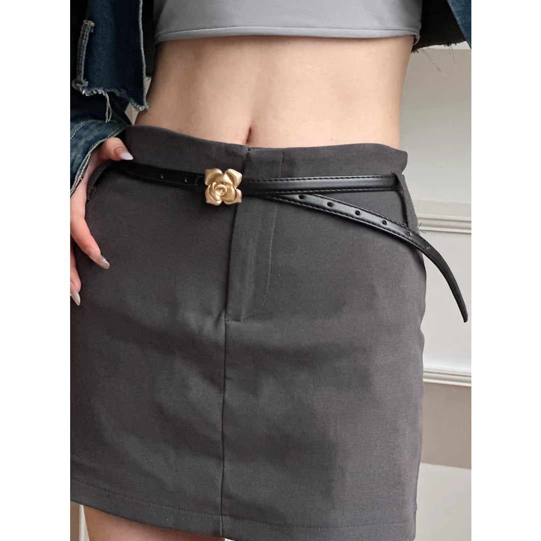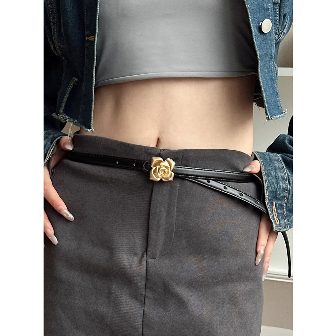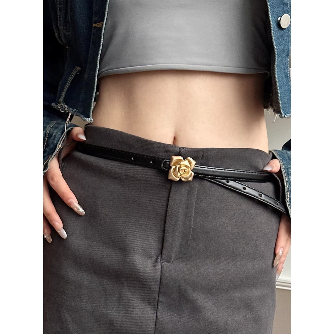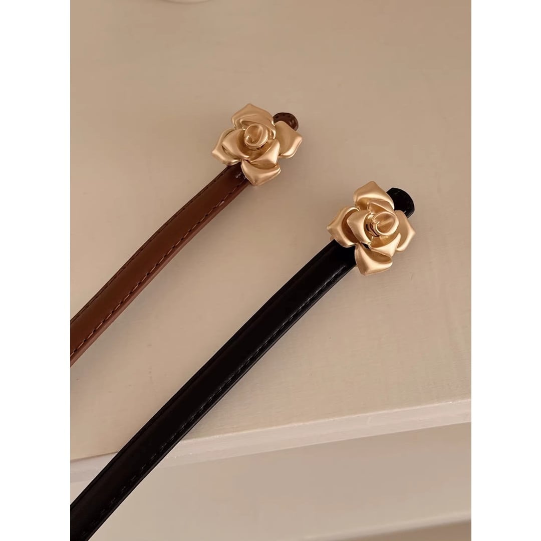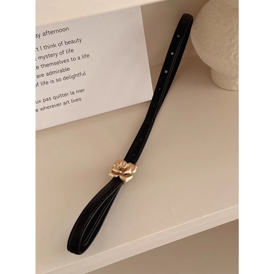 スリムなシルエットを上品に引き立てる、フラワーモチーフのベルト。