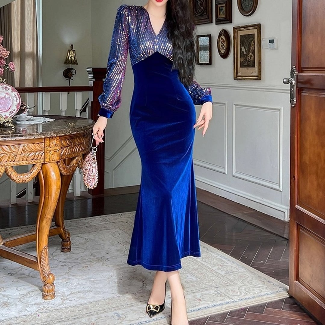 Vネックがデコルテを美しく演出するミディドレス。長袖なので、一枚で上品に着こなせます。パーティーやディナーなど、特別な日の装いに最適です。