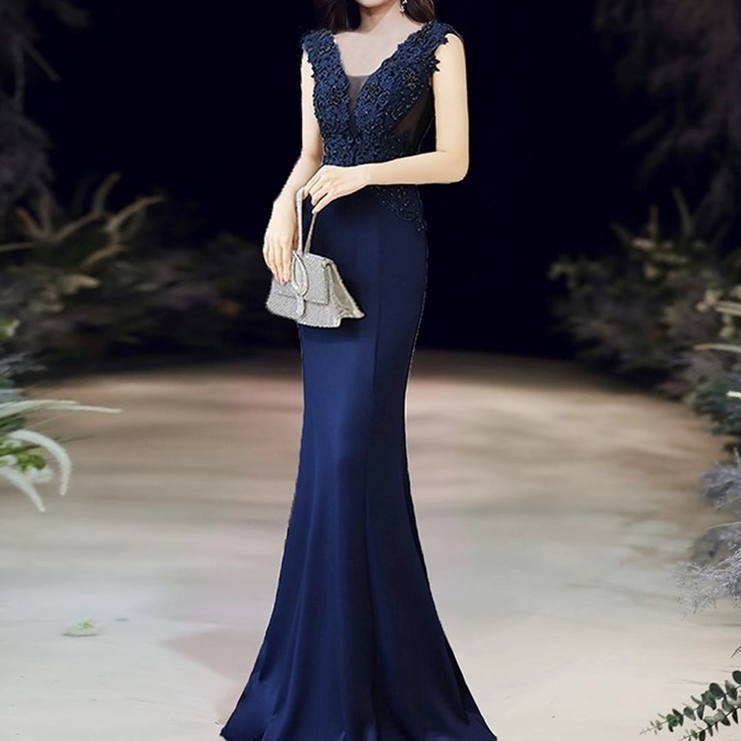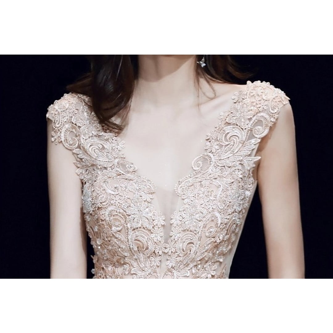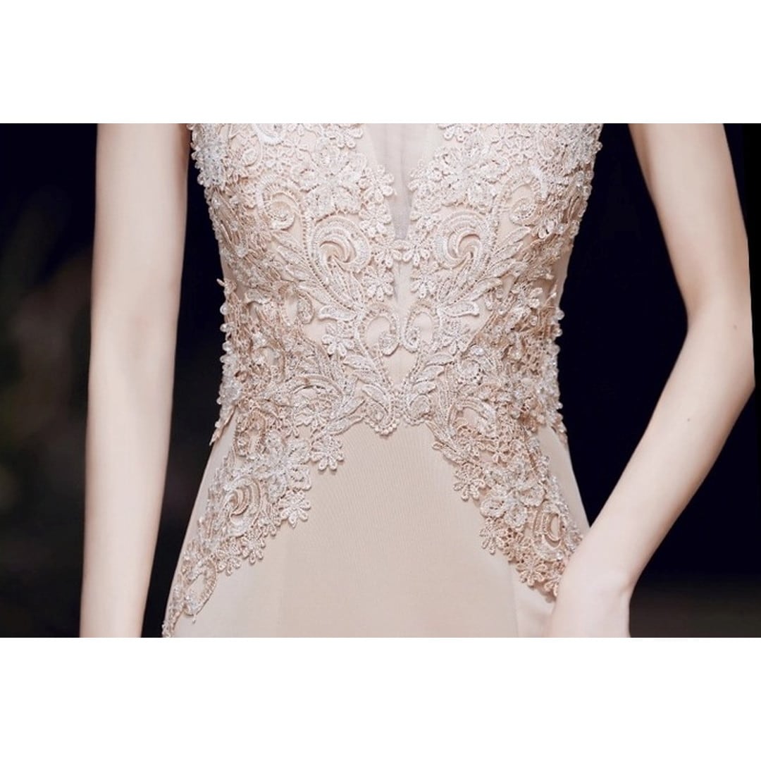 Vネックがデコルテを美しく演出し、洗練された大人の魅力を引き立てます。スリーブレスのデザインが、より一層スタイリッシュな印象を与え、パーティーや特別な日の装いに最適です。裾に向かって広がるフレアシルエットが、優雅で女性らしい雰囲気を演出します。