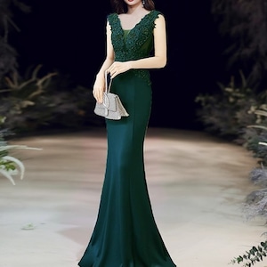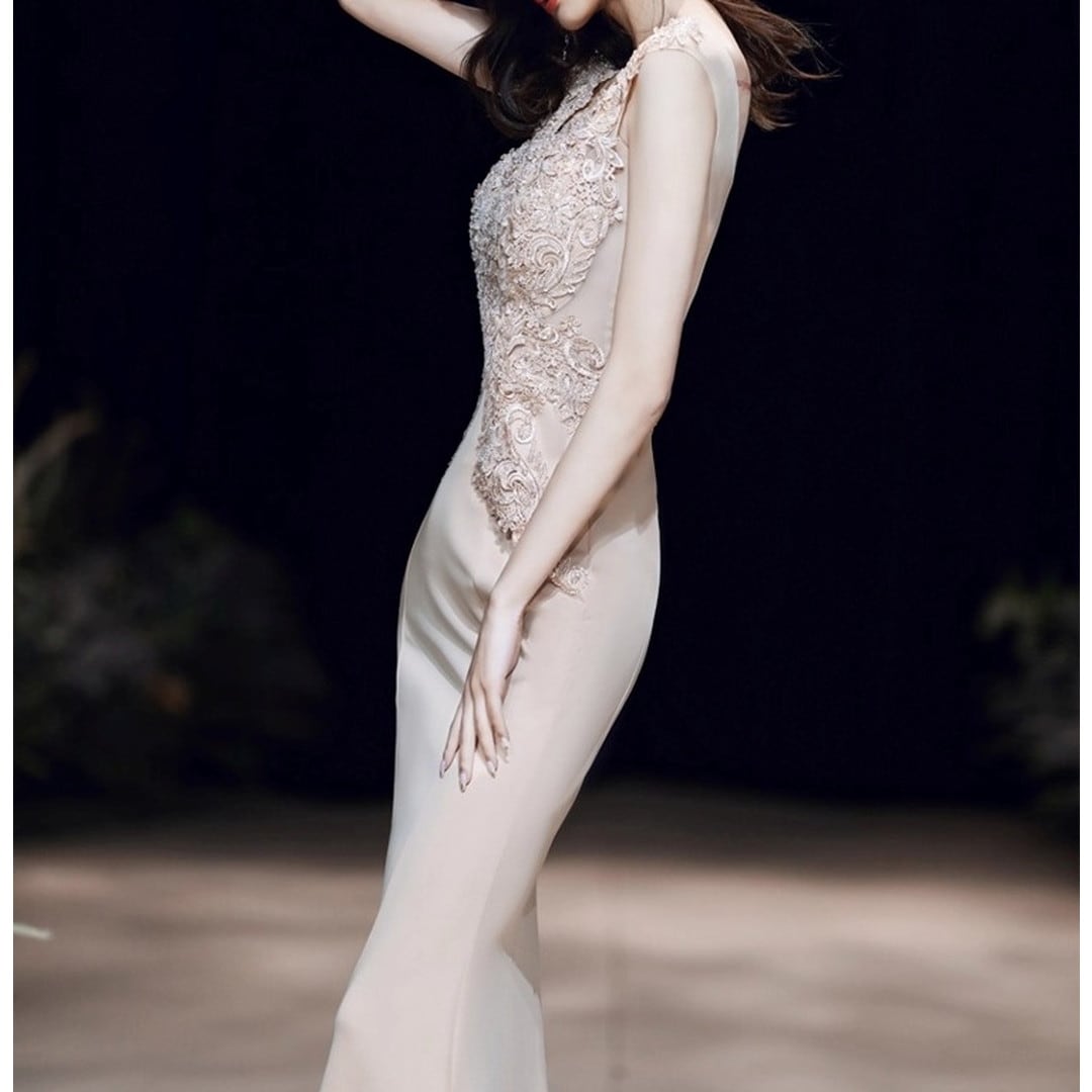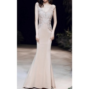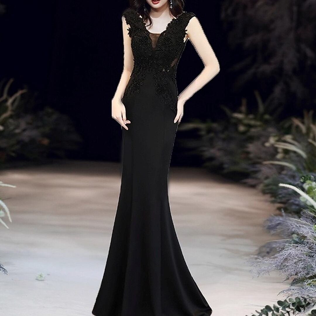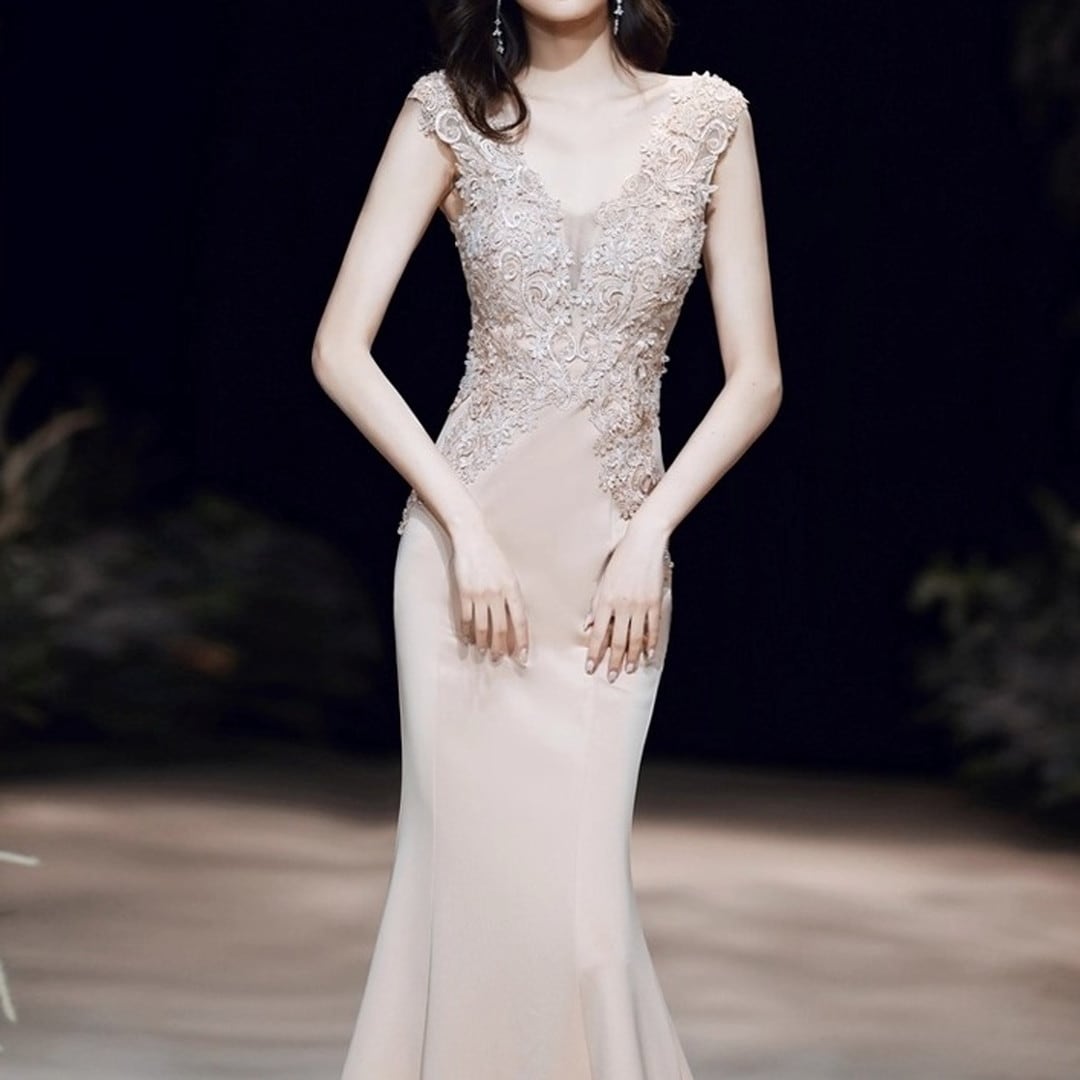 Vネックがデコルテを美しく演出し、洗練された大人の魅力を引き立てます。スリーブレスのデザインが、より一層スタイリッシュな印象を与え、パーティーや特別な日の装いに最適です。裾に向かって広がるフレアシルエットが、優雅で女性らしい雰囲気を演出します。