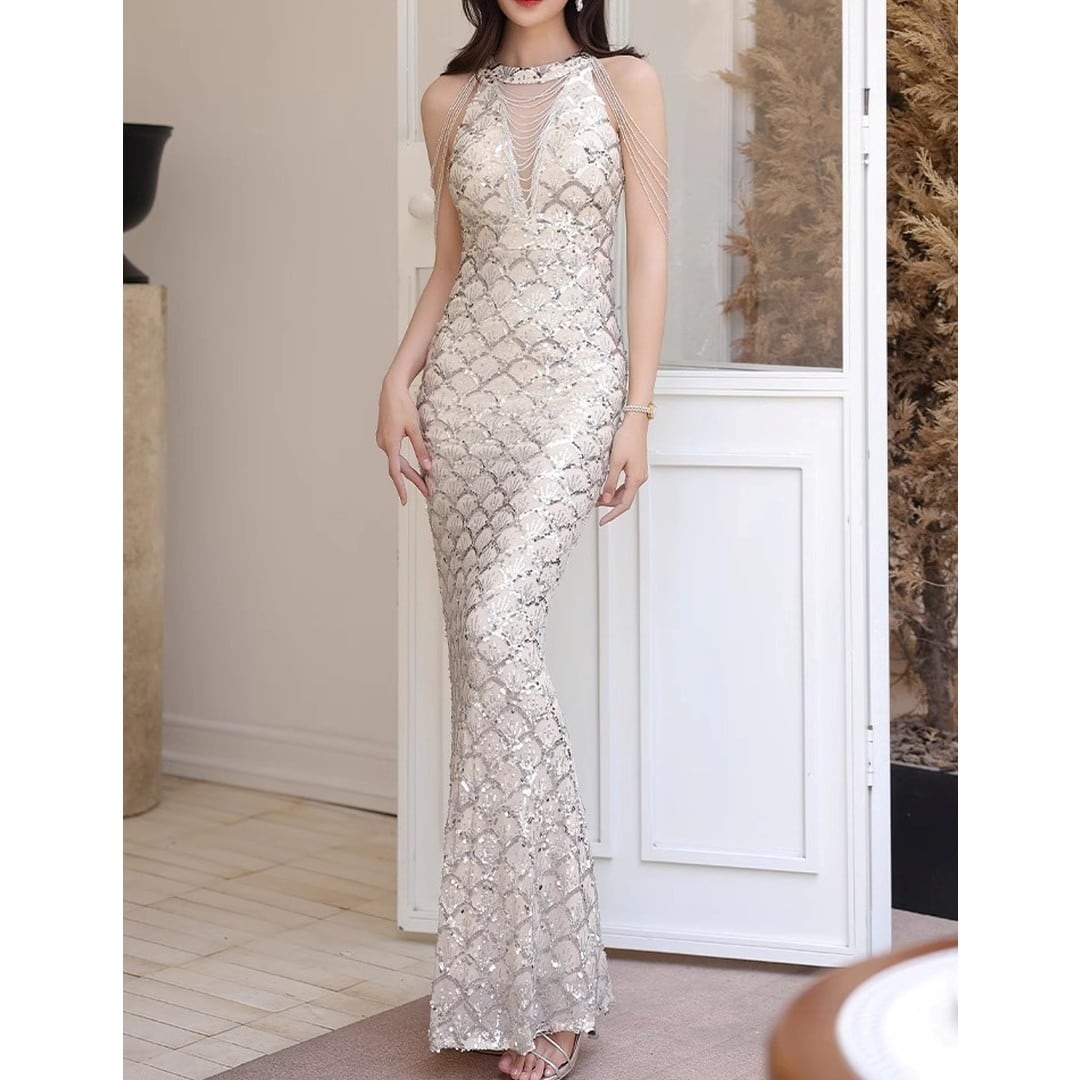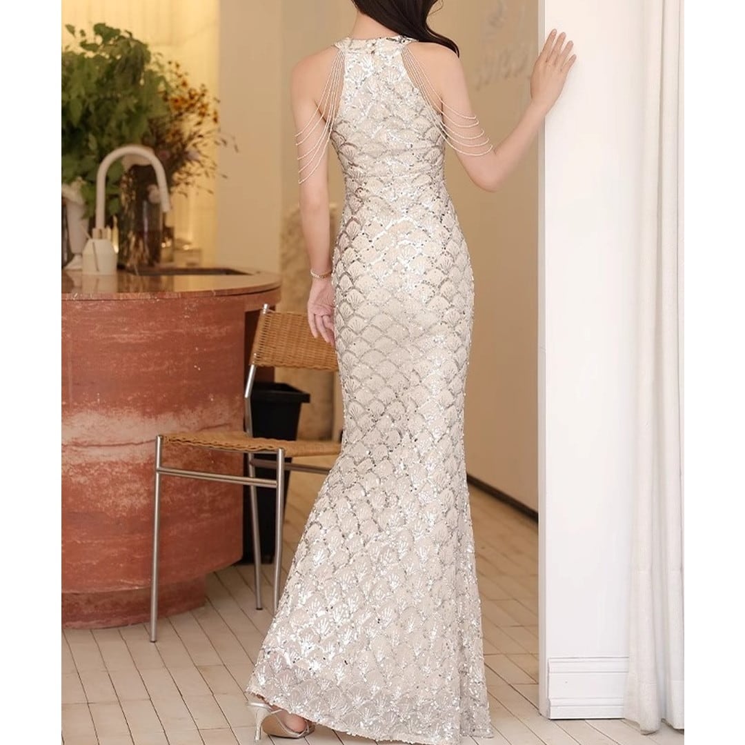 上品なデザインとエレガントなシルエットが際立つ、首元のハルターネックが美しいラインを描き、肩を華やかに見せるデザインです。