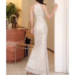 長めのマキシ丈が大人の女性らしさを引き立て、パーティーや特別な日のデートなど、幅広いシーンで活躍します。