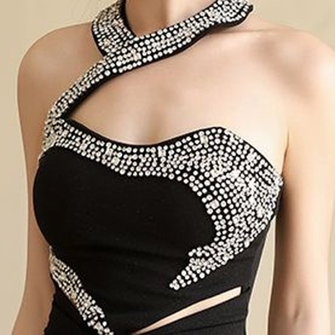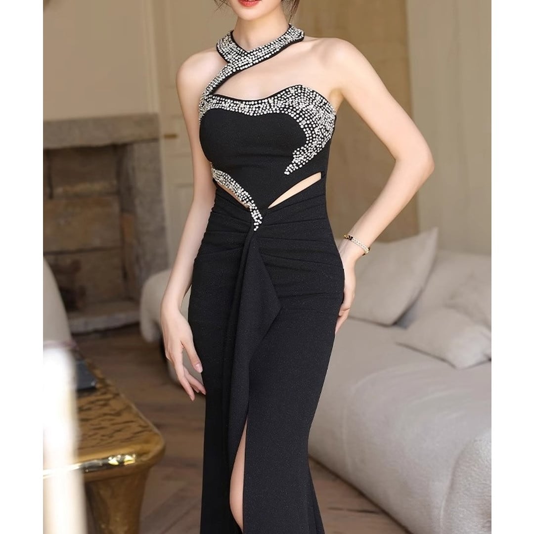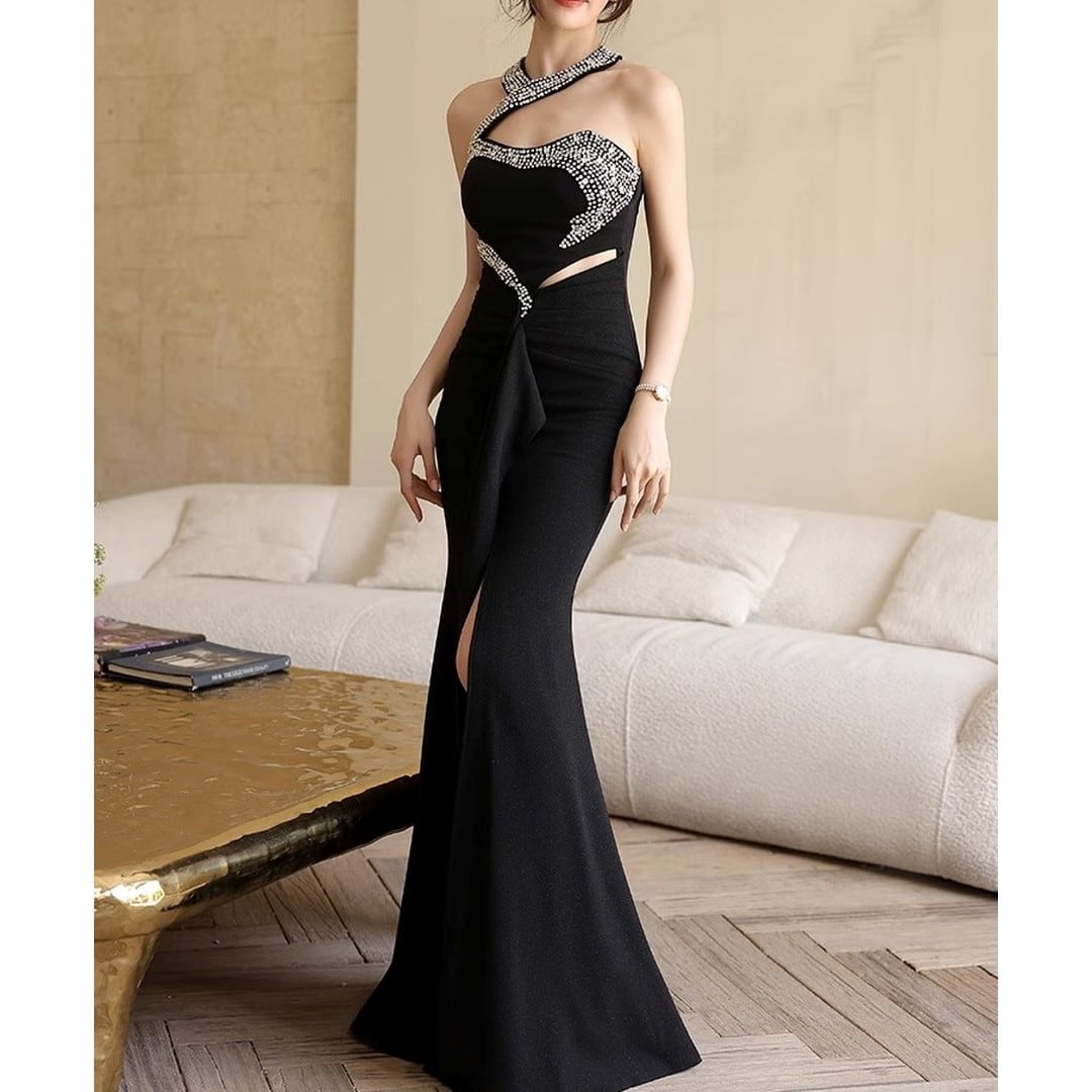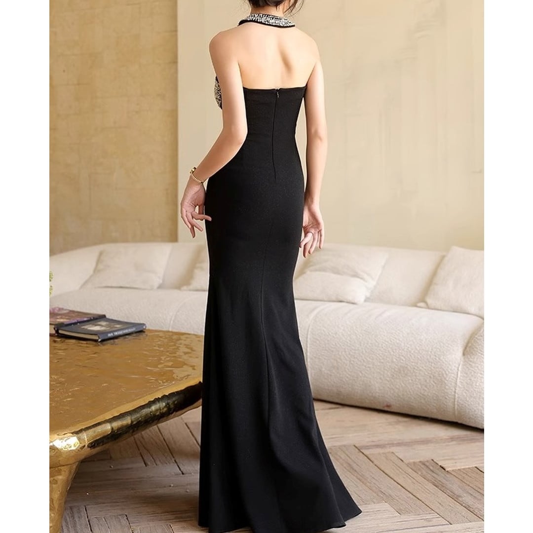 特別な夜にふさわしい、美しさを際立たせるイブニングドレス。ホルターネックのデザインがデコルテを美しく演出し、目を引くアクセントが華やかさを添えます。マキシ丈のシルエットとスリットが、エレガントで洗練された印象を与えます。パーティやイベントなど、特別な日の装いに最適です。