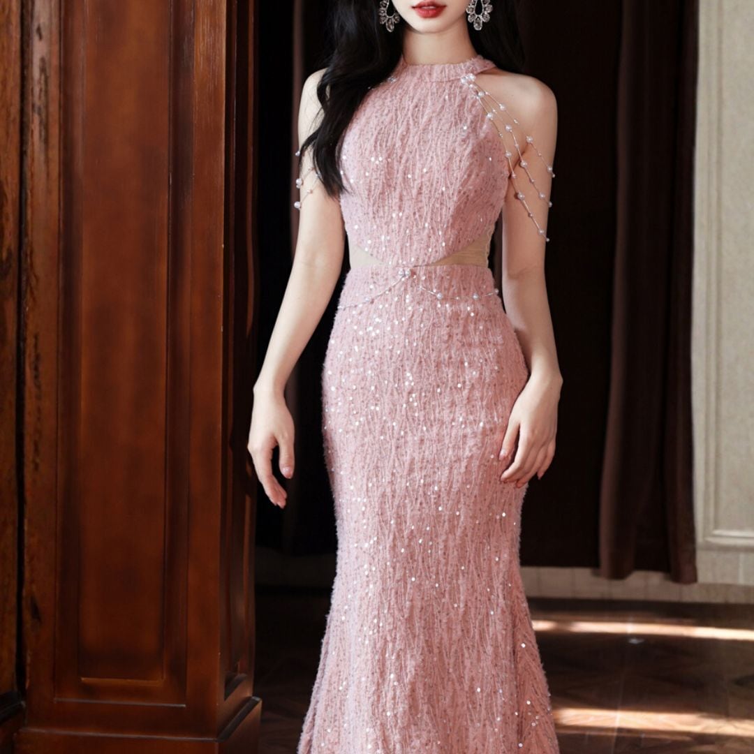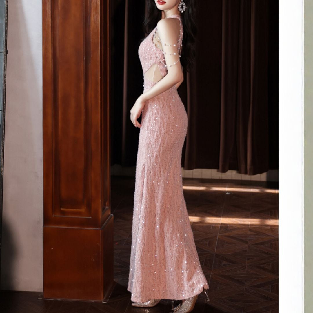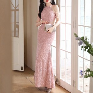 ホルターネックのデザインが首元を美しく演出し、洗練された印象を与えます。